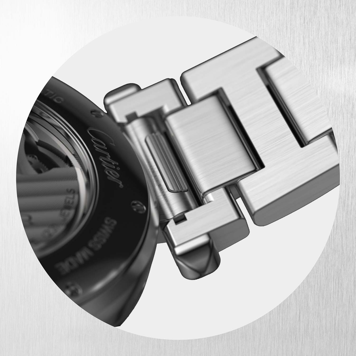 The fundamentals of the Pasha de Cartier are still present here, with the round case, now with a sleek polished bezel and more angular shapes, attached to lug modules with still two “Clou de Paris” at their extremities. In the same vein, the crown is still protected by a chained-cap that unscrews and reveals the winding crown – both elements being topped by a sapphire cabochon. However, as you can see, all the elements have been modernized and are now sharper, better defined and less flamboyant, thanks to brushed surfaces. Also, the case is 100m water-resistant, giving this watch a slightly sportier vocation than a Tank or a Santos.