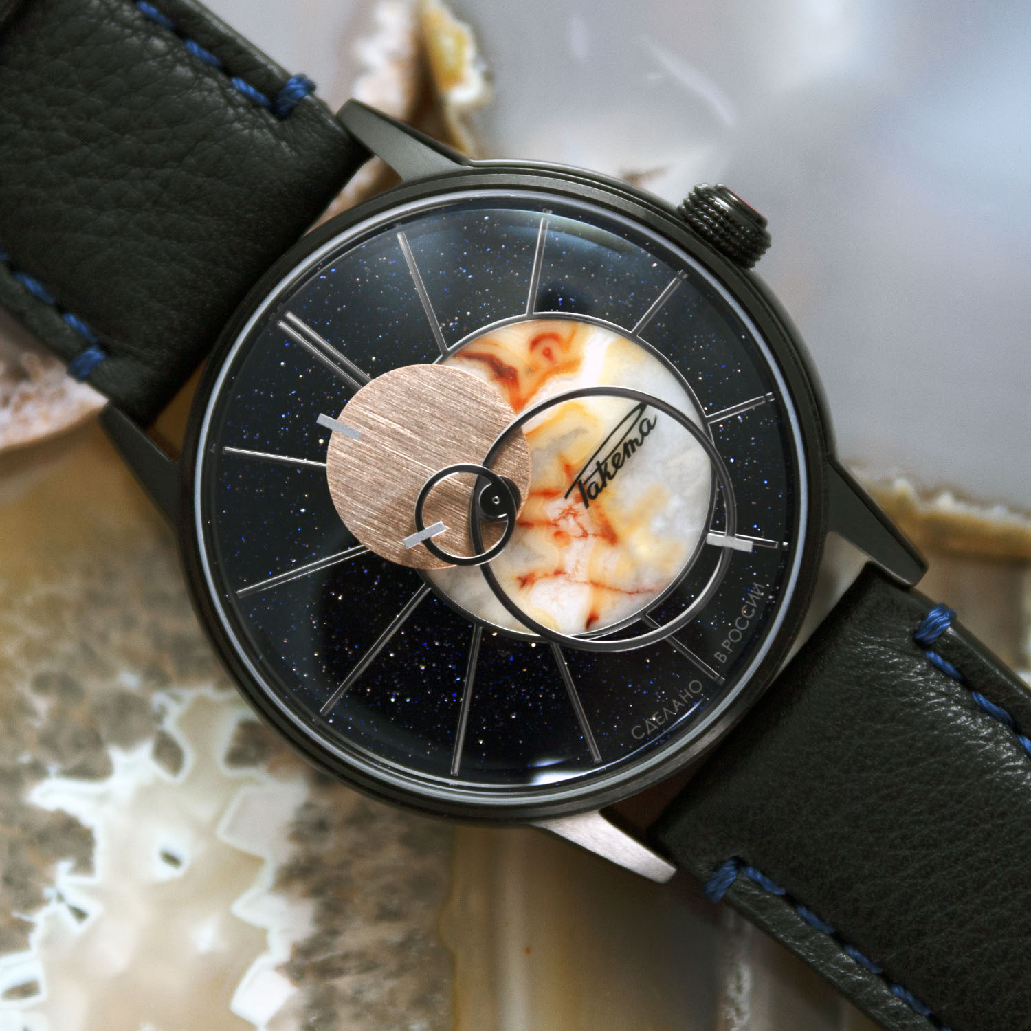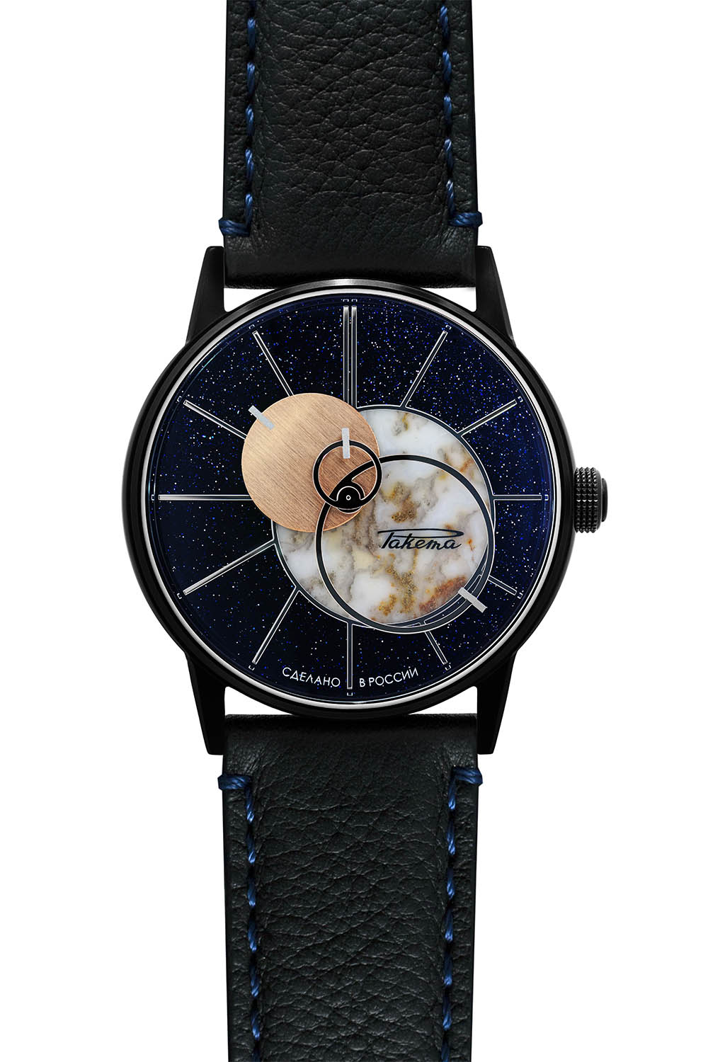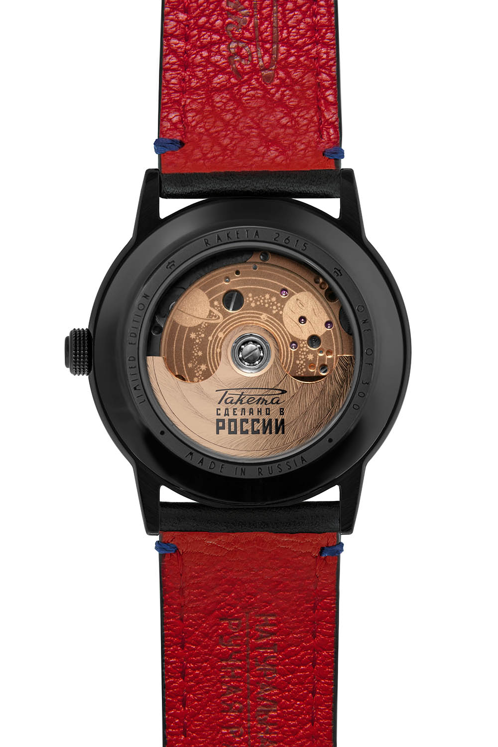 Revealed under the new see-through caseback is an automatic movement entirely manufactured (including critical elements such as the hairspring) in Raketa’s manufacture, near Saint Petersburg. For this edition, the solid and no-nonsense self-winding movement has been specifically decorated with stars and planets engraved on the automatic bridge, a rotor that features hand-made Neva waves and the movement is gold plated to remind the colour of the sun. Beating at 18,000 vibrations/hour, this tried-and-tested movement (developed during the Soviet era) has a 40h power reserve.