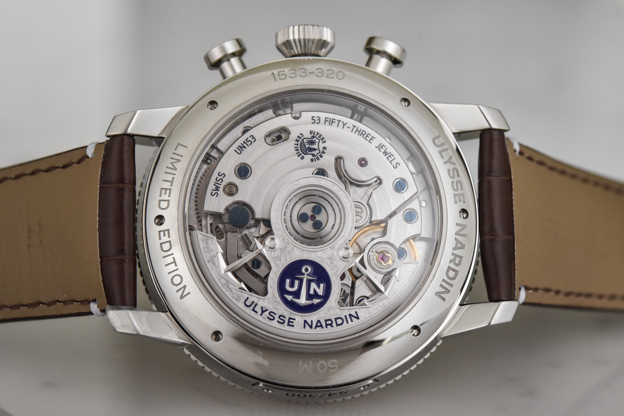 Quick facts: 44mm x 13.66mm – stainless steel – fluted bezel – sapphire crystal caseback – 50m water-resistant – blue PVD or white varnished dial – 30-min chronograph sub-dial at 3, months and small seconds at 9, date at 6 o’clock – calibre UN-153 manufacture – automatic – Silicium escapement, balance spring and anchor – 28,800vph – 52h power reserve – hours, minutes, small seconds, date, chronograph and annual calendar – limited to 300 pieces in each colour – EUR 10,600
