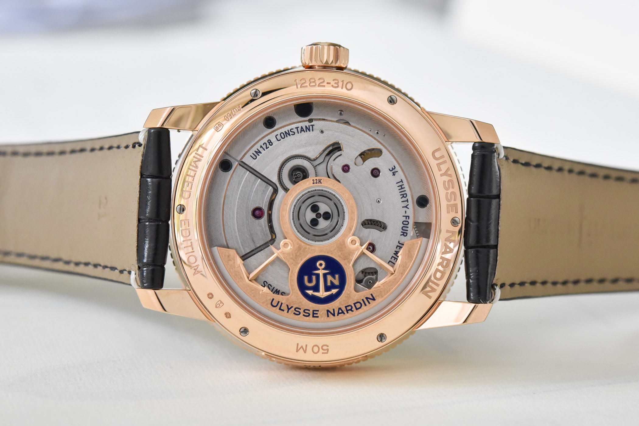 Quick facts: 42mm x 11.93mm – 5N rose gold – fluted bezel – sapphire crystal caseback – 50m water-resistance – black Grand Feu enamel dial – power reserve at 12, flying tourbillon at 6 o’clock – rose gold-coloured hands – calibre UN-128 manufacture – COSC-certified automatic – flying tourbillon with Ulysse anchor escapement (constant) – Silicium escapement wheel, balance spring and anchor – 18,000vph – 60h power reserve – hours, minutes, flying tourbillon, power reserve indicator – limited to 175 pieces – EUR 42,200