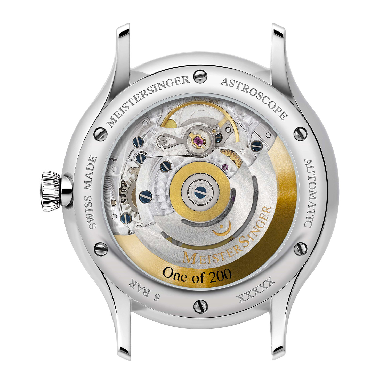 This year, a new MeisterSinger Astroscope special series limited to 200 pieces with a black sunburst finish and sunny yellow is released. Thanks to a Super-LumiNova coating, the hands, hour indices and weekday display glow in the dark. The new model comes with a supple leather strap in matching yellow, and the back is printed with the mention “One of 200” on the crystal.