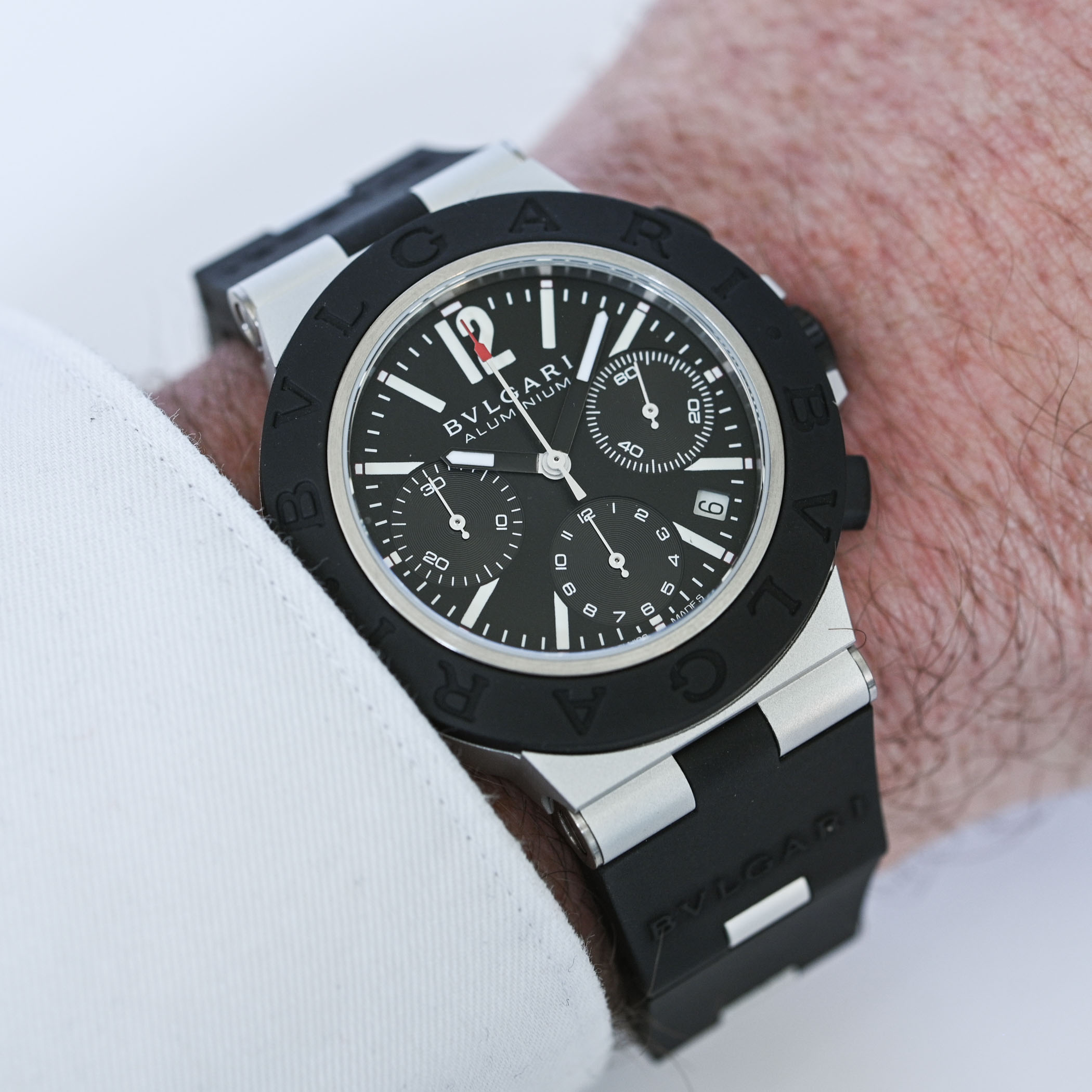 The new Bulgari Aluminium Chronograph 41mm models are priced at EUR 5,000. The white/panda model is now available, the black model is expected in June 2023.
