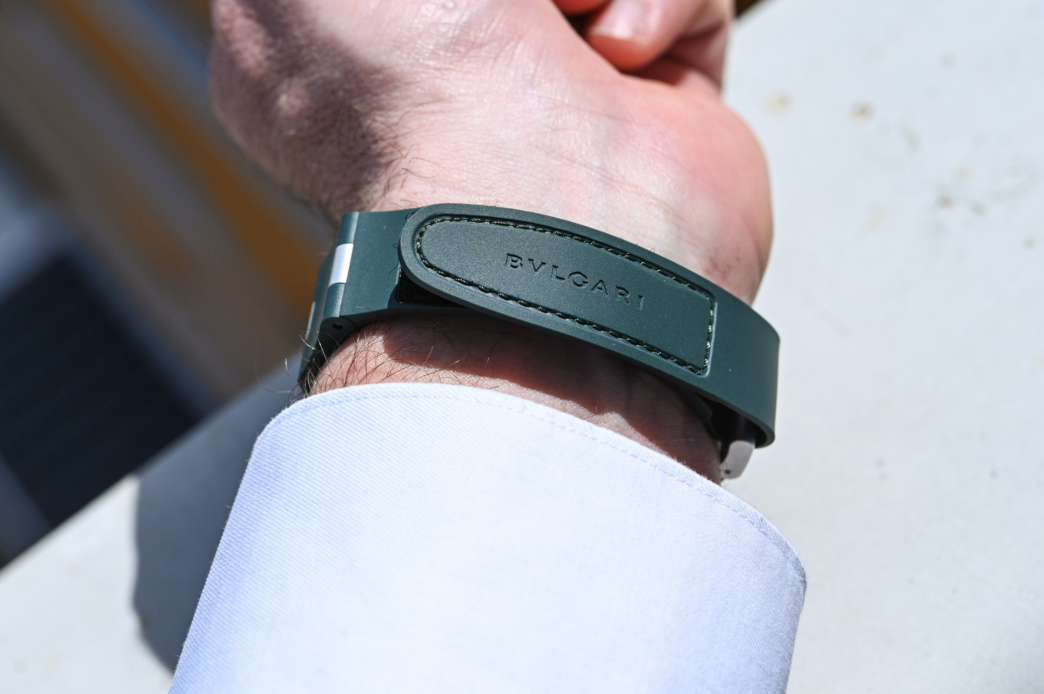 That was for the design, but there are some technical updates too on the 2023 Bulgari Aluminium Chronograph. First, the case is now slightly larger, at 41mm instead of 40mm. It retains the same construction, with a matte finished aluminium mid-case, a black rubber bezel, a 100m water-resistance and a titanium caseback, treated with DLC. The crown and chronograph pushers are in DLC-coated titanium. No evolution on the side of the FKM rubber strap, still made of large links connected by aluminium articulated pieces. Last, there’s a new movement inside, named calibre B381 – an automatic Sellita SW300 base with a Dubois-Depraz module on top.