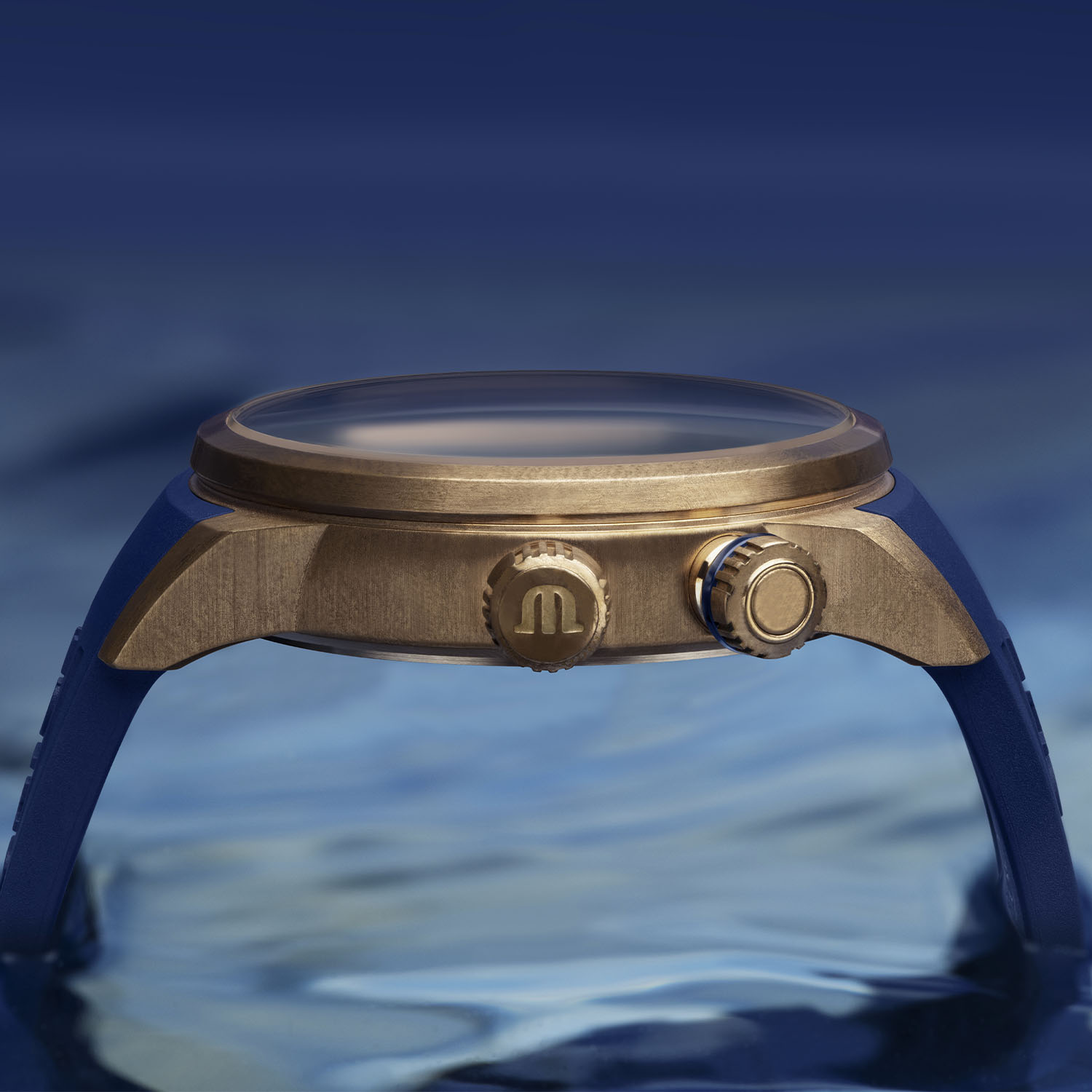 The Pontos S Diver steel models come with three straps: an M-branded fabric strap and two integrated rubber straps embossed with Maurice Lacroix. The bronze version comes with a blue rubber strap and a calfskin leather strap featuring a gold M logo. These straps are all fitted with quick-release spring bars allowing you to swap your straps in seconds with no tool.