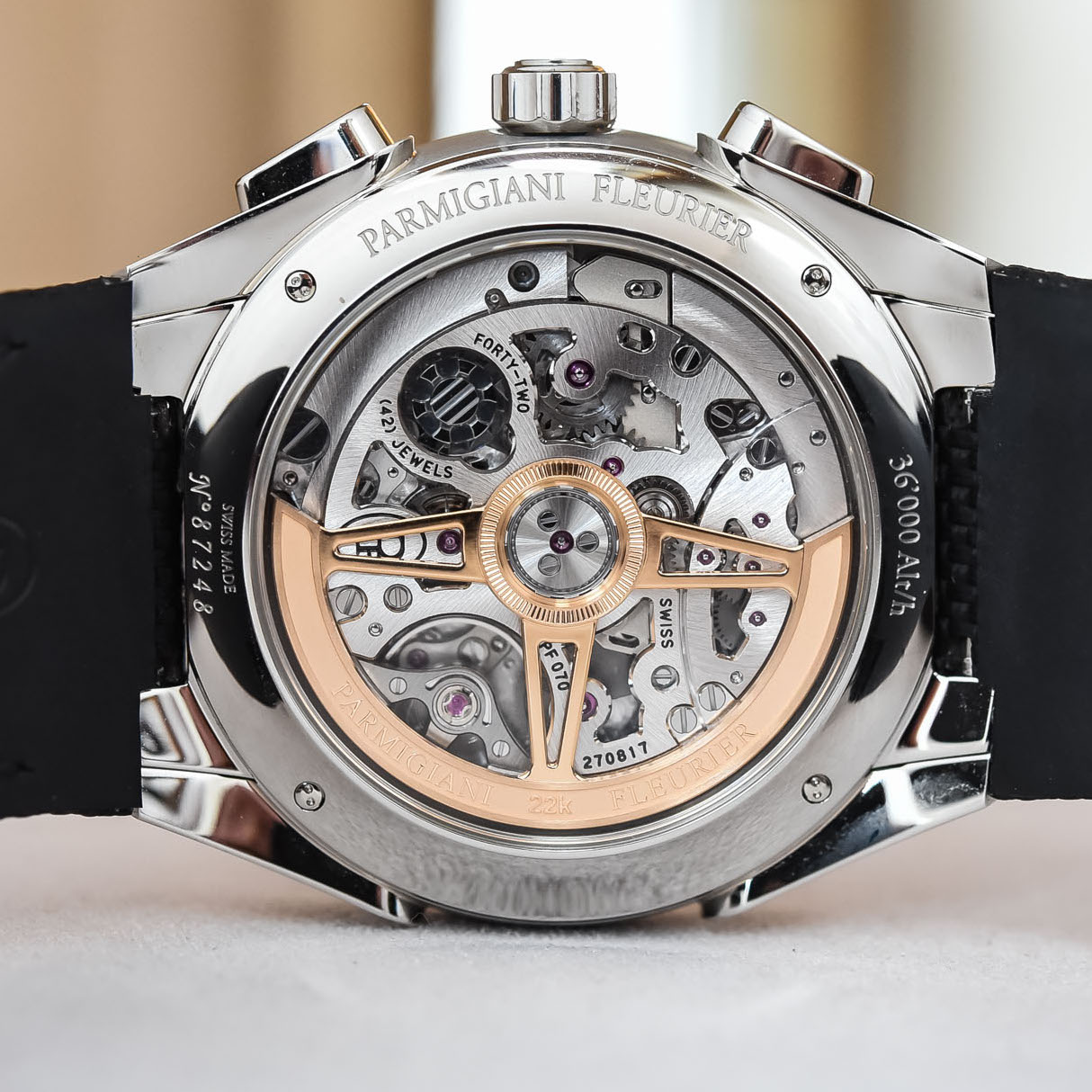 The sapphire caseback offers a view of the in-house PF070 calibre, an automatic integrated chronograph with a column wheel and vertical clutch. The 315-part movement has a high frequency of 5Hz or 36,000vph and a 65-hour power reserve. Chronometer-certified by COSC, the movement is beautifully hand-finished and features a solid gold rotor inspired by the shape of the steering wheel of the legendary Ferrari 250 GTO of the 1960s.