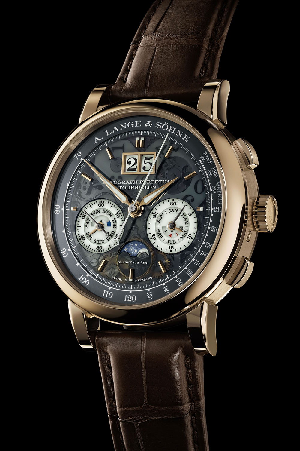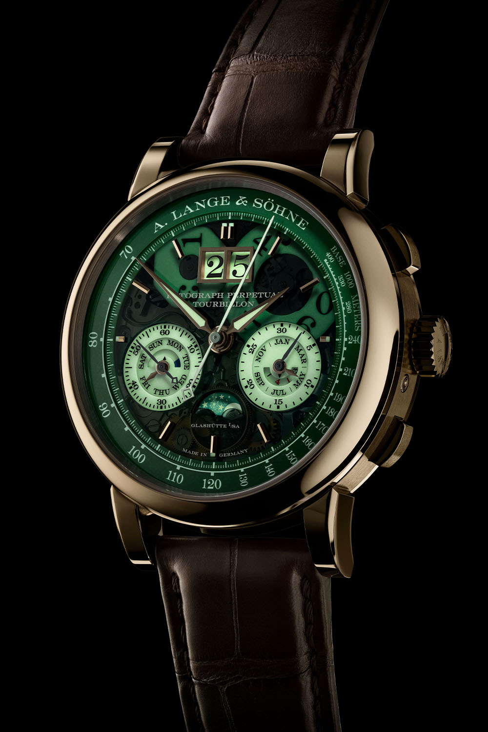 Lange’s impressive triple-complication masterpiece gets the royal treatment with a Honeygold case and enough luminous material to reveal its innermost secrets in the dark.