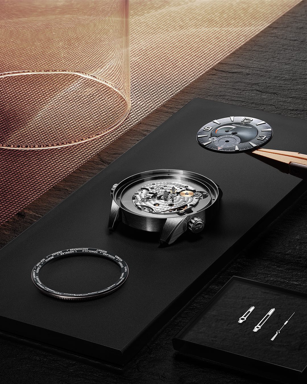 Jaeger-LeCoultre’s in-house calibre 939, visible through the sapphire caseback, is manufactured, assembled and decorated in the brand’s manufacture in Le Sentier. This automatic base movement, which powers the Geographic module on top, has 295 components, beats at 28,800vph and delivers a 70-hour power reserve.