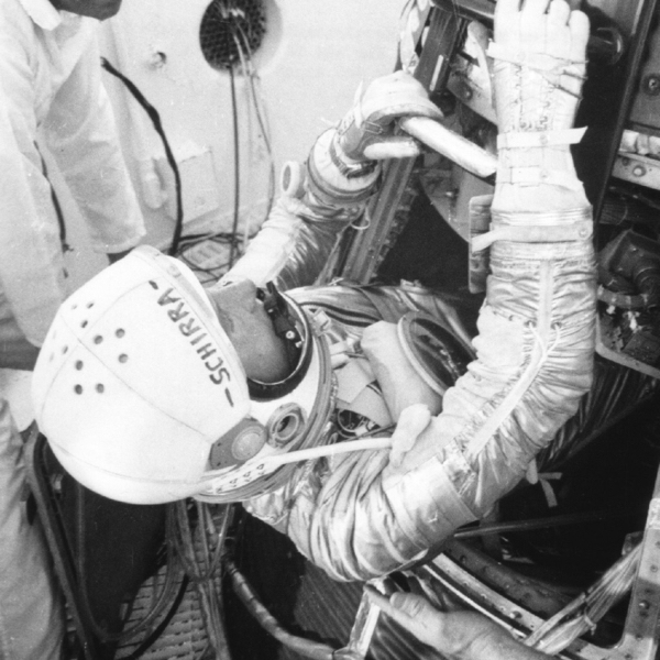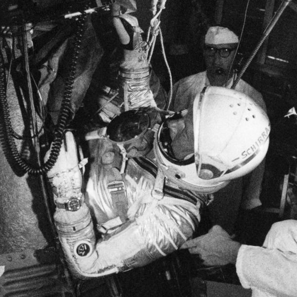 As for an Omega wristwatch, the story goes back to October 3rd, 1962, and the Mercury-Atlas 8 mission. It was the fifth United States crewed space mission, part of NASA’s Mercury programme. Astronaut Walter “Wally” Schirra orbited the Earth six times in the Sigma 7 spacecraft during a nine-hour flight. And, while this was the longest US crewed orbital flight yet achieved, as far as we’re concerned here, this mission would remain historically important because it was the first time a Speedmaster went into space. Below, images of Wally Schirra wearing the Speedmaster during test procedures (all images by NASA).