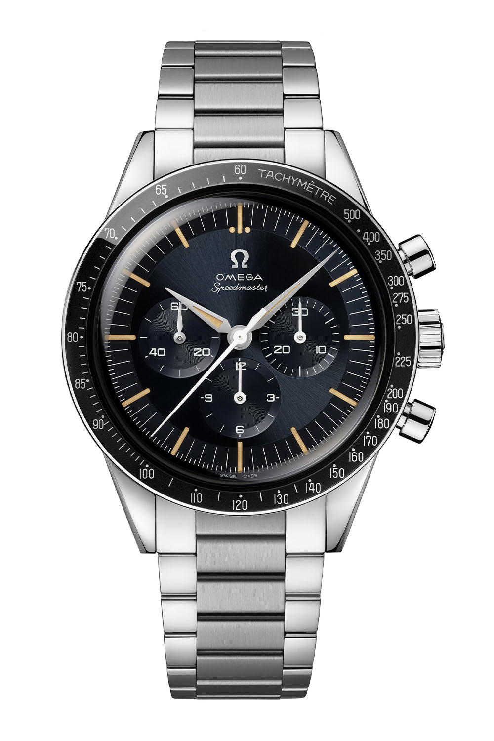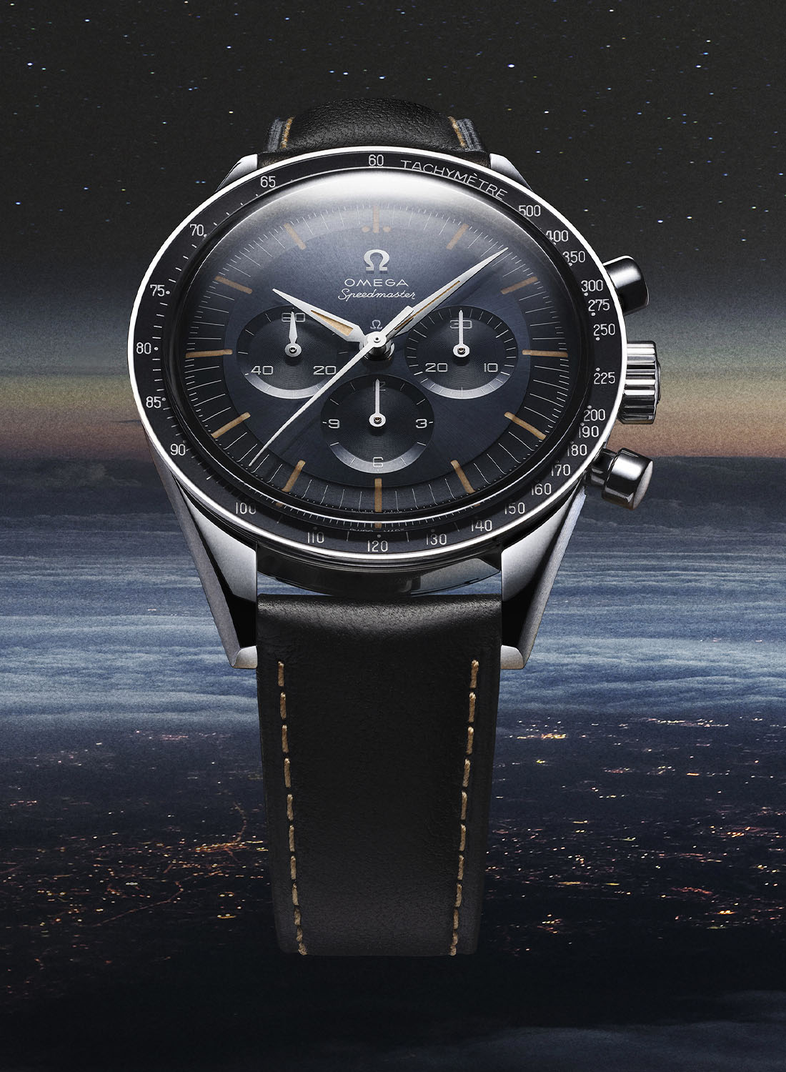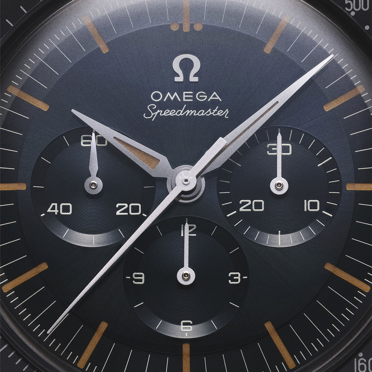 What’s truly new here is the dial, which has not only changed in shape but also comes in an unprecedented colour and finish. To replicate the tone of some CK 2998 watches produced in the 1960s, Omega has given the 2024 Speedmaster First Omega in Space a sunray-brushed dark grey-blue dial. Another evolution, to remain true to the look of vintage models, the Speedmaster FOiS returns to a step dial, while the 2012 edition had a flat dial. It comes with an applied ? logo, and the Omega and Speedmaster logos use the historical font found on the CK2998.