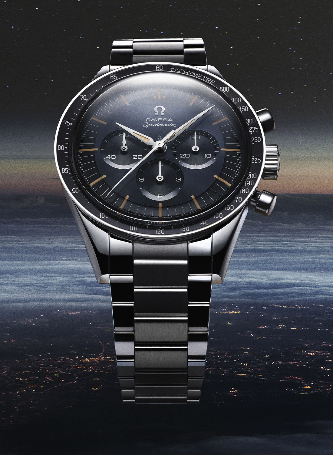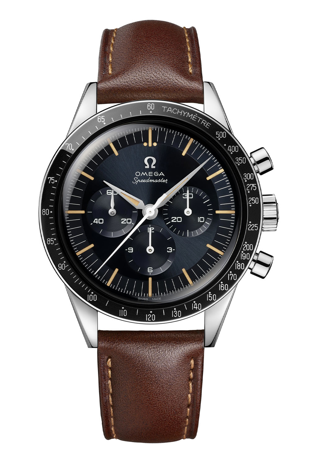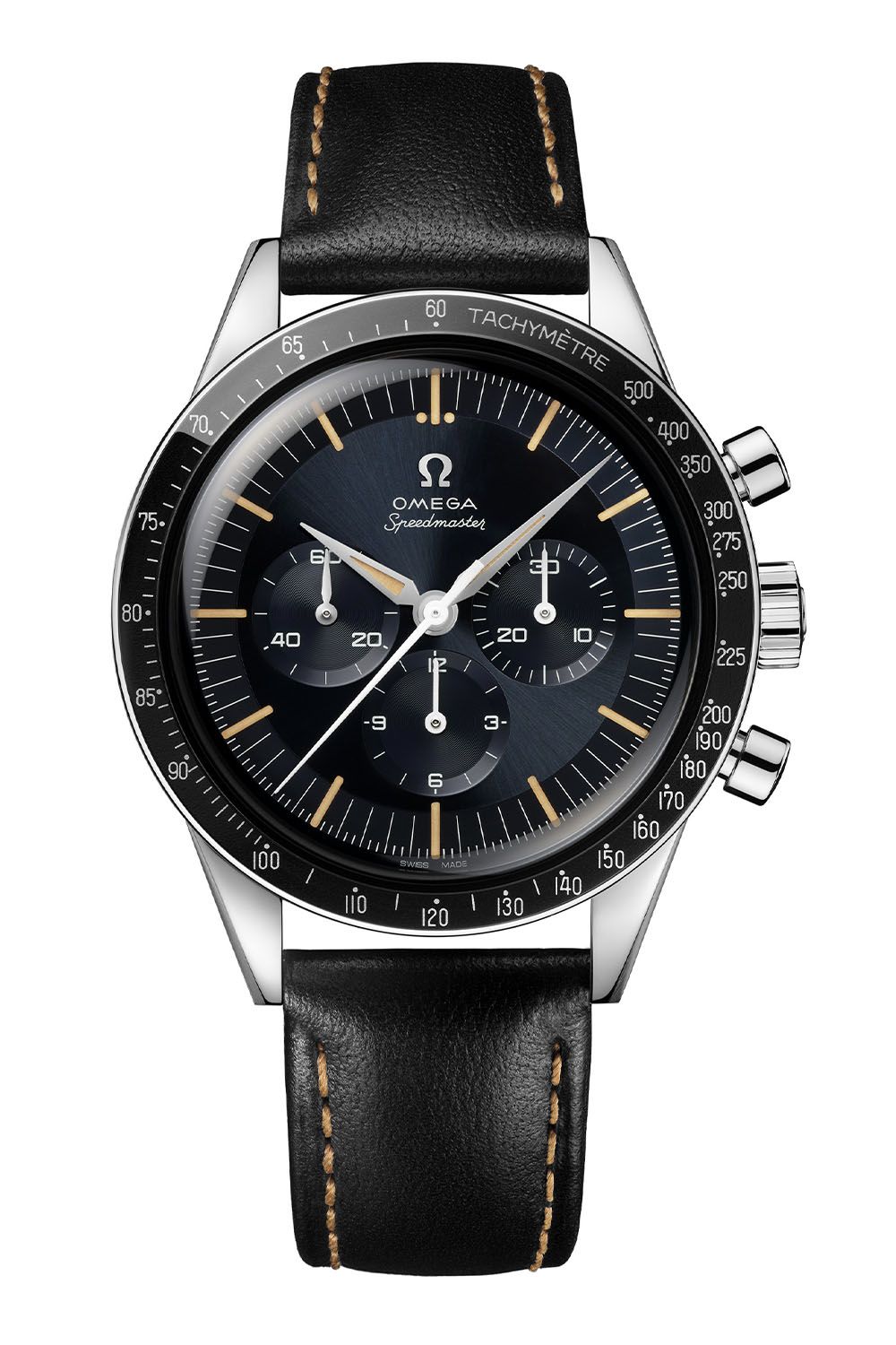 What’s truly new here is the dial, which has not only changed in shape but also comes in an unprecedented colour and finish. To replicate the tone of some CK 2998 watches produced in the 1960s, Omega has given the 2024 Speedmaster First Omega in Space a sunray-brushed dark grey-blue dial. Another evolution, to remain true to the look of vintage models, the Speedmaster FOiS returns to a step dial, while the 2012 edition had a flat dial. It comes with an applied ? logo, and the Omega and Speedmaster logos use the historical font found on the CK2998.