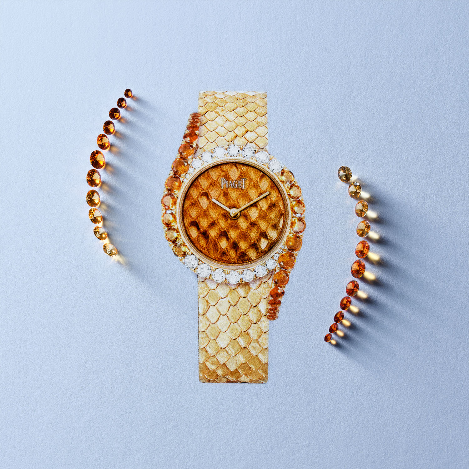 The second, more flamboyant Limelight Gala Precious model features a vibrant orange Grand Feu enamel dial. However, the technique used here, first introduced on the 2019 Extremely Lady watch, mimics the undulating scales of a snake. Entirely crafted by hand, master engravers create overlapping, organic scale-like patterns on the gold elements. Some scales are polished while others are engraved with fine lines, creating spectacular plays of light. On the gold snakeskin dial, the bright orange Grand Feu enamel is surrounded by a serti descendu setting of sunset-coloured spessartite garnets and diamonds.