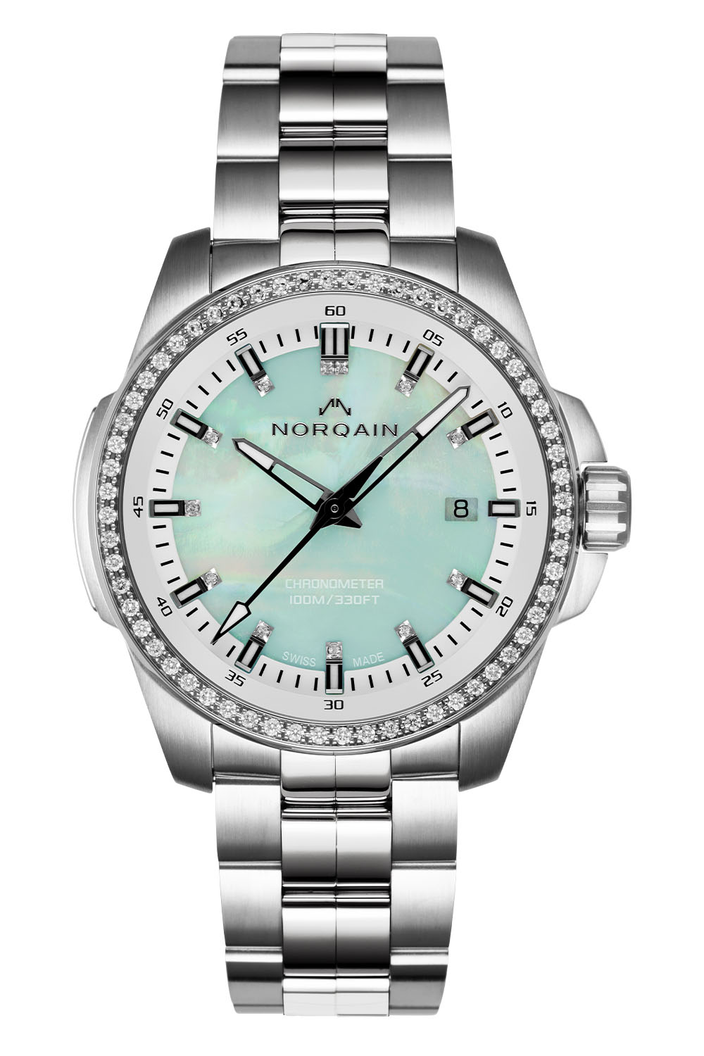 Last for this 2023 Norqain Independence collection is a feminine watch, which is identical in specifications to the 2 gradient models above, yet with a twist in colours and luxury. On this 40mm steel edition, powered by a COSC-certified Sellita SW200-1, the dial is made of mint mother-of-pearl and decorated with 12 white diamonds and a date window at 3 o’clock. The bezel is also adorned with stones, with a line of 60 white diamonds. This watch is presented on an integrated on-the-fly micro-adjustment steel bracelet (EUR 5,790) or a white rubber strap (EUR 5,540).