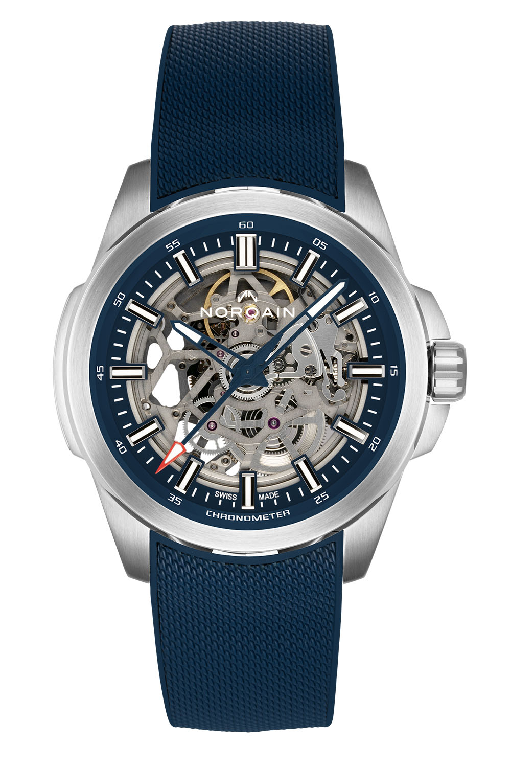 Following the first Independence Skeleton 42mm models launched in 2021 and 2022, Norqain now introduces two new editions, one with DLC coating and red gold plated hands, the other in a more classic steel case with blue accents on the flange and hands. On both models, the 42mm case is made of steel and is polished, satin-finished and sandblasted depending on the surfaces, and features the customisable Norqain plate on the side. The black DLC-coated edition comes with a black inner flange and red gold accents on the hands and markers, while the other edition is all about blue, yet with a red-tipped seconds hand. At the heart of these watches is an openworked, chronometer-certified version of the Sellita SW200-1, here dubbed Calibre NN08S, with an open back. The DLC model is available on a black-coated steel bracelet (EUR 4,450) or a black rubber strap (EUR 3,980), and the steel and blue edition can be worn on a steel bracelet (EUR 3,990) or a blue rubber strap (EUR 3,740).