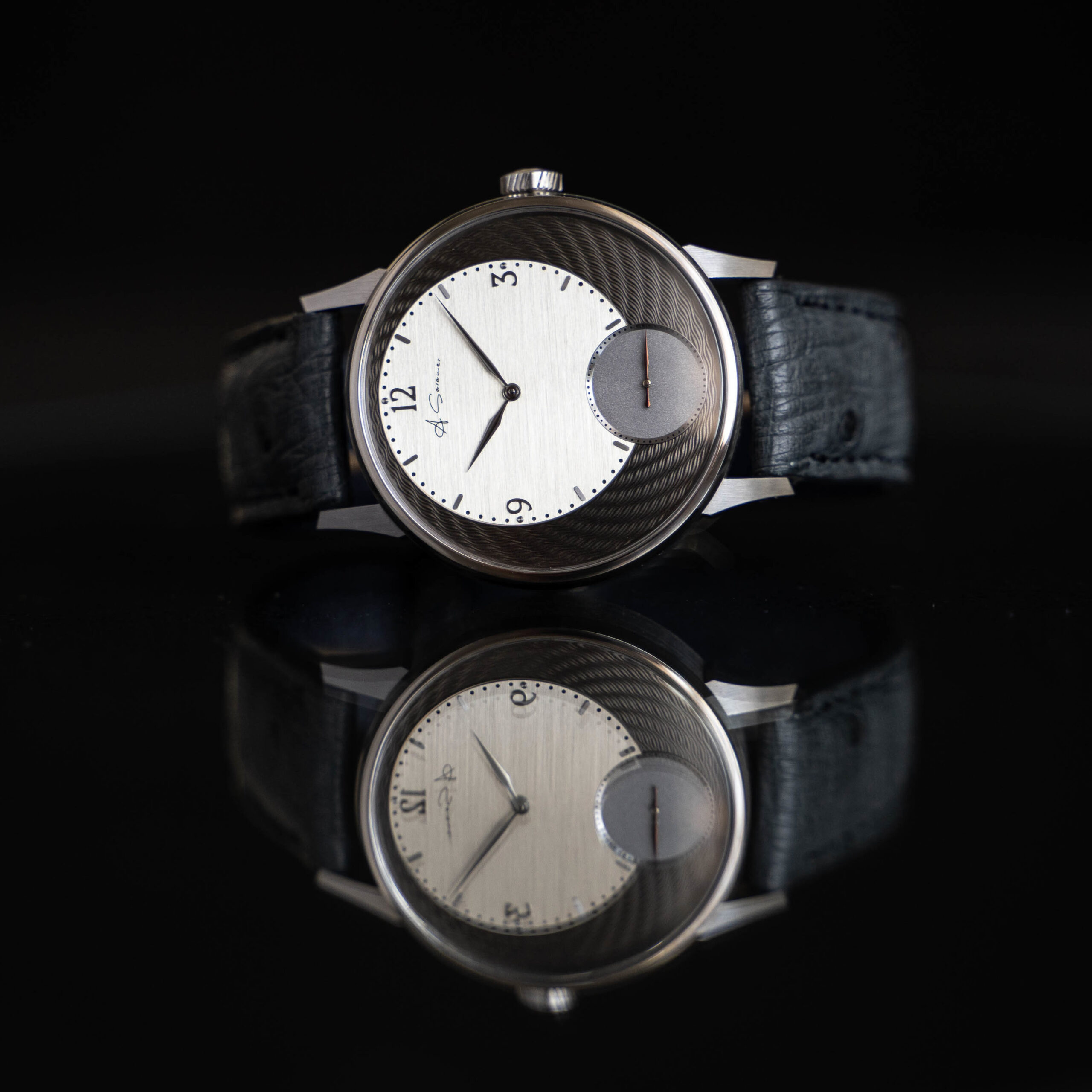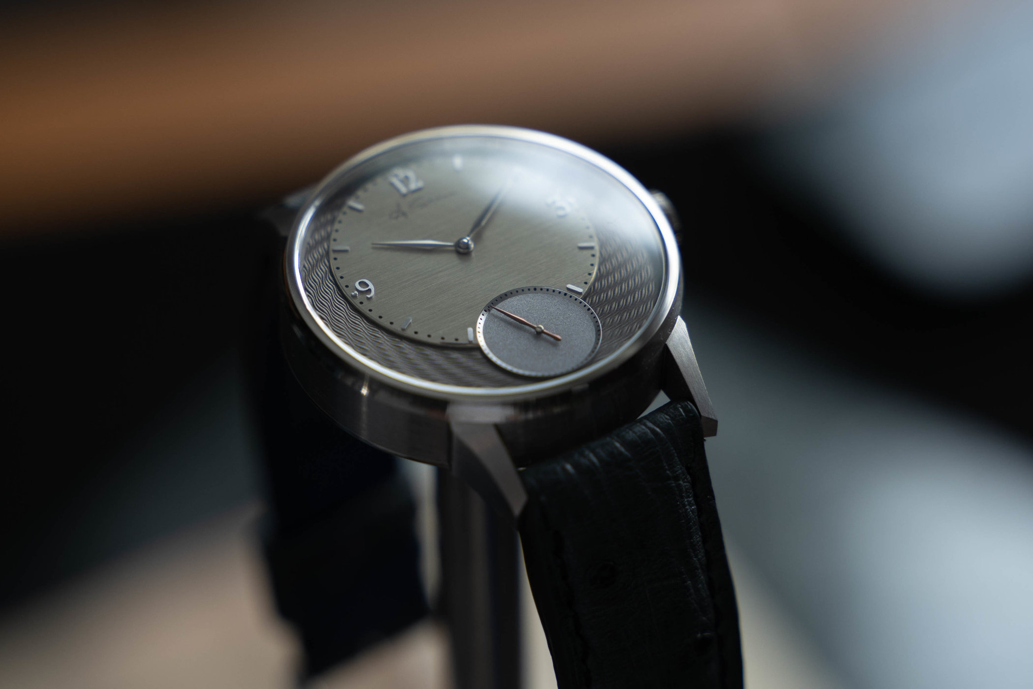 The dial is a work of art, with a hand-applied guilloché pattern on the outer edge. The main dial has a very fine horizontal brushing, with a grained small seconds subdial cutting into it. The devil is in the detail, however, as you’ll notice the position of the hour and minute hands is pushed up a bit. The indices and numerals are made and applied by hand, and the seconds subdial is framed by a sloped and dotted track. In terms of colours, the dial shows a fine balance of various tones of grey and silver, with a hint of champagne on the offset hour and minute dial section. Aaron also designed the hands himself, with a polished spade-shaped hour and minute hand and a heat-coloured small seconds hand. The only script on the dial is Aaron’s personal signature, which is very subtly done.