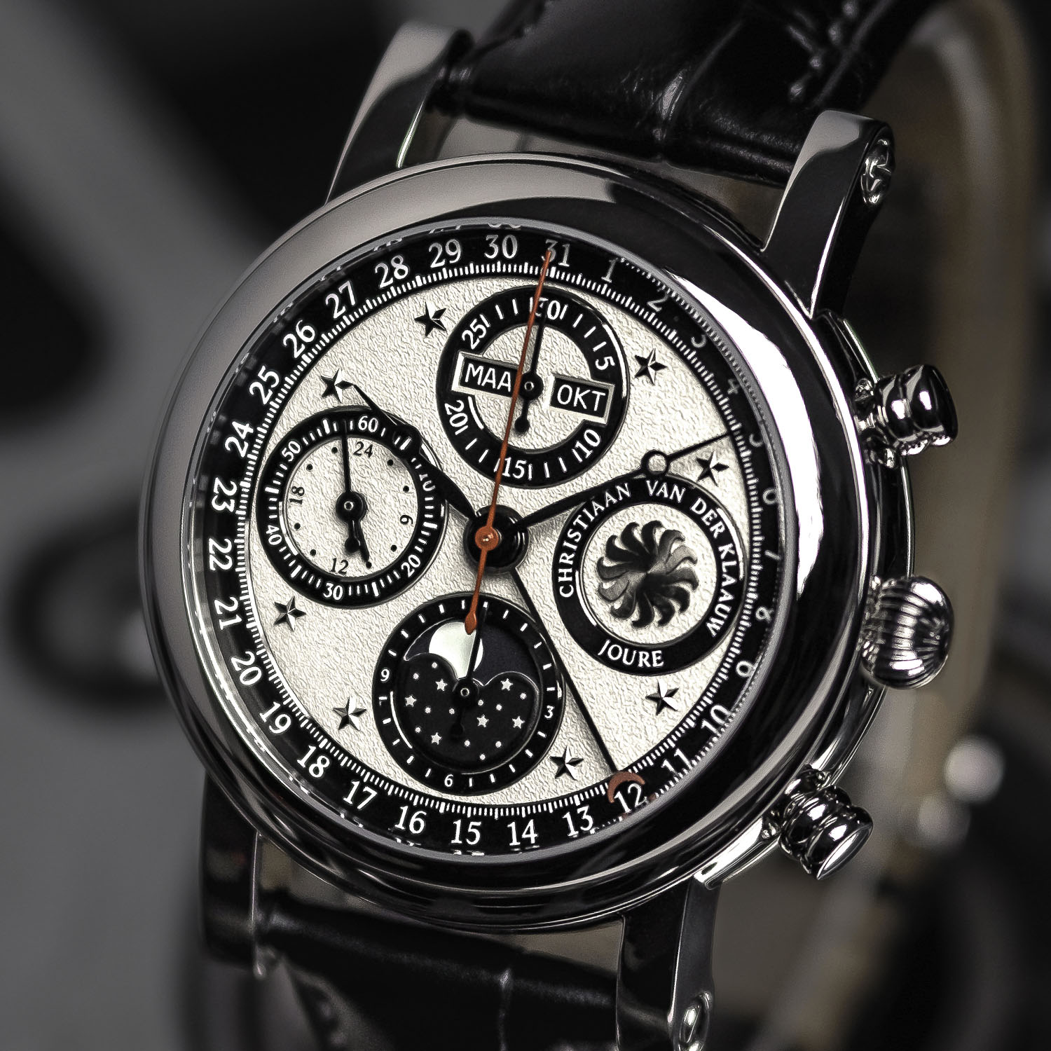 Christiaan van der Klaauw is amongst the most famous watchmakers in the Netherlands – a man born and raised in the city of Leiden, where Christiaan Huygens, the greatest Dutch scientist of all time, started his studies… An honourable member of the AHCI, he has dedicated almost entirely his career to the creation of astronomical watches, led by the fantastic Planetarium, a marvel of miniaturisation that displays the solar system on the wrist. However, for the first model created under his leadership, Pim Koeslag decided to redesign one of the brand’s most classic models, the Ariadne, a full calendar chronograph with moonphase. Despite being simpler mechanically than the Planetarium or the Real Moon Tides, it is still deeply influenced by heavenly bodies and astronomical phenomena.