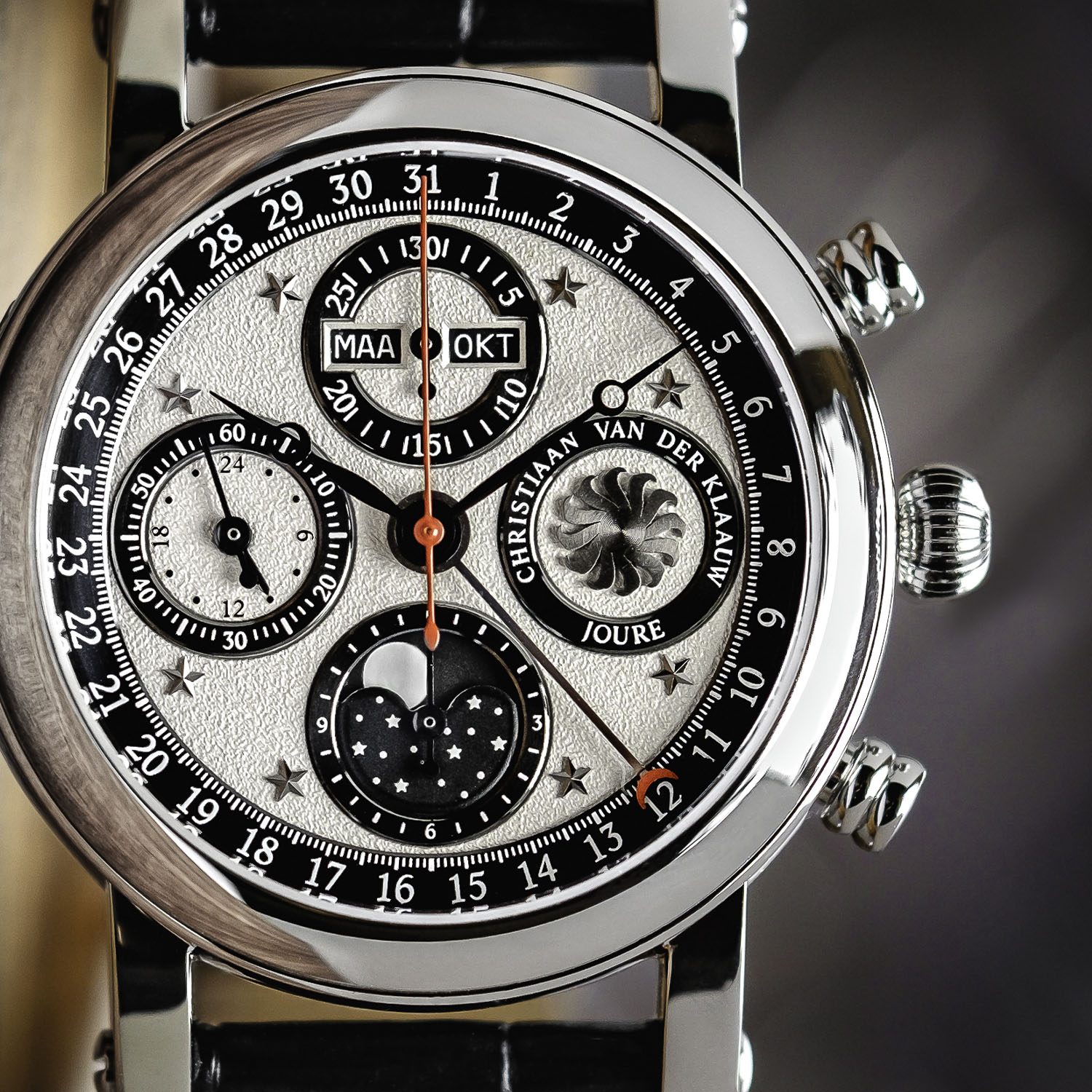 The display is both complex and classic, mostly due to a familiar movement inside. This stAriadne, just like the classic Ariadne, combines chronograph counters and calendar indications appealingly – date by hand, day and month in windows at 12, moon phase indicator at 6 and 24h indicator at 9. This stAriadne version distinguishes itself with a fog grey dial with a frosted effect and, of course, the applied star-shaped markers. The radially brushed counter rings – normally silver-toned – are executed in deep black, as are most of the hands, the moon phase display, and the discs for the day and month. Note that the month and day discs can be ordered either in English or in Dutch (I’d recommend the latter, just to add more exclusivity).