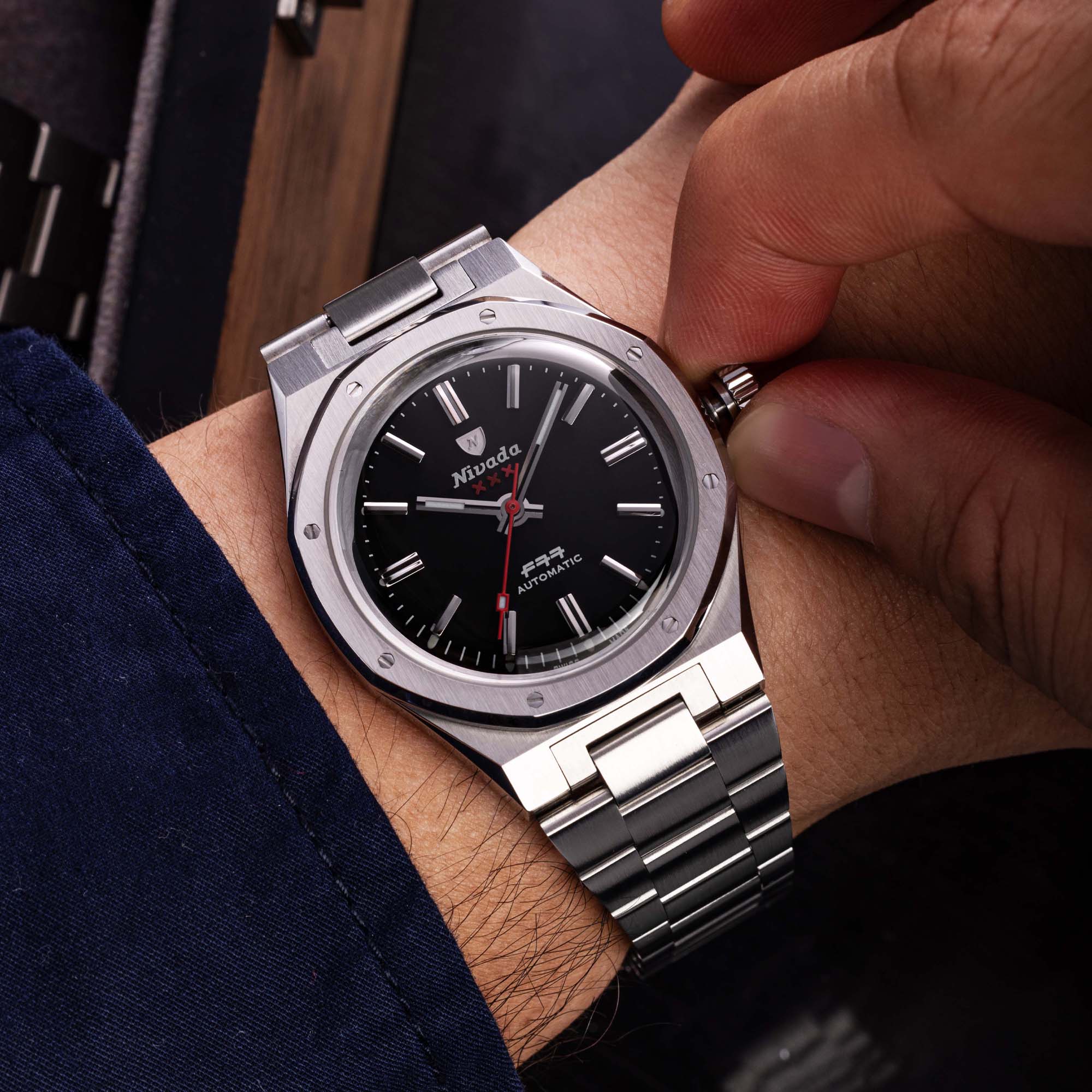 What sets the Ace Jewelers x Nivada Grenchen F77 Amsterdam limited edition apart is its striking black matte dial, adorned with applied silver-coloured indices and an applied red XXX just below the Nivada logo (a reference to the city’s flag). The distinctive baton central hour and minute hands feature luminous inserts, while the central seconds hand stands out in red, complete with a rectangular “lollipop” tip touched with lume.