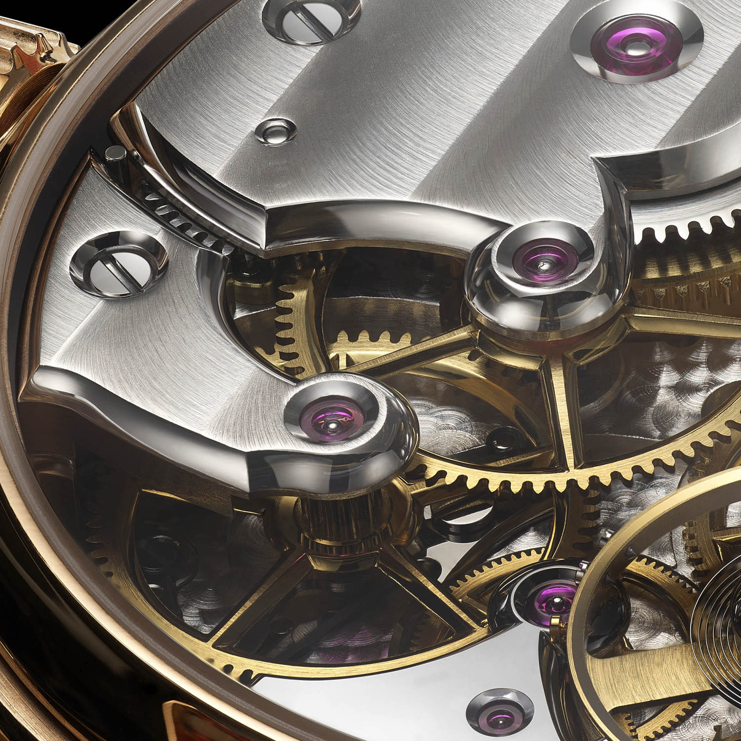 The mainplate and bridges are constructed with a distinct symmetrical design in mind and are made of German Silver. Throughout the entire movement, you can witness Rexhep’s dedication to traditional craftsmanship. Everywhere you look you can see the Haute Horlogerie levels of finishing, including Côtes de Genève, perlage, circular graining, polished countersinks, black-polished screws and balance bridge. Even the spokes on the wheels are bevelled and polished by hand, with no less than 140 inward angles on the wheels of both independent gear trains. As with every independent watchmaker on this level, the finished is pushed to new heights with every new watch and this is no exception.