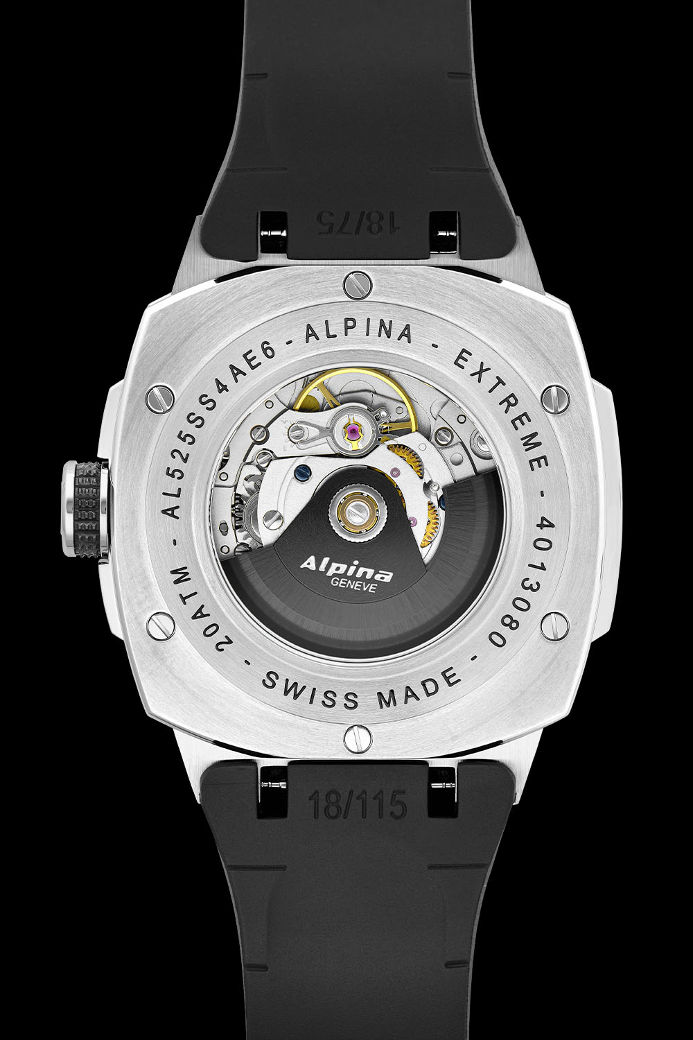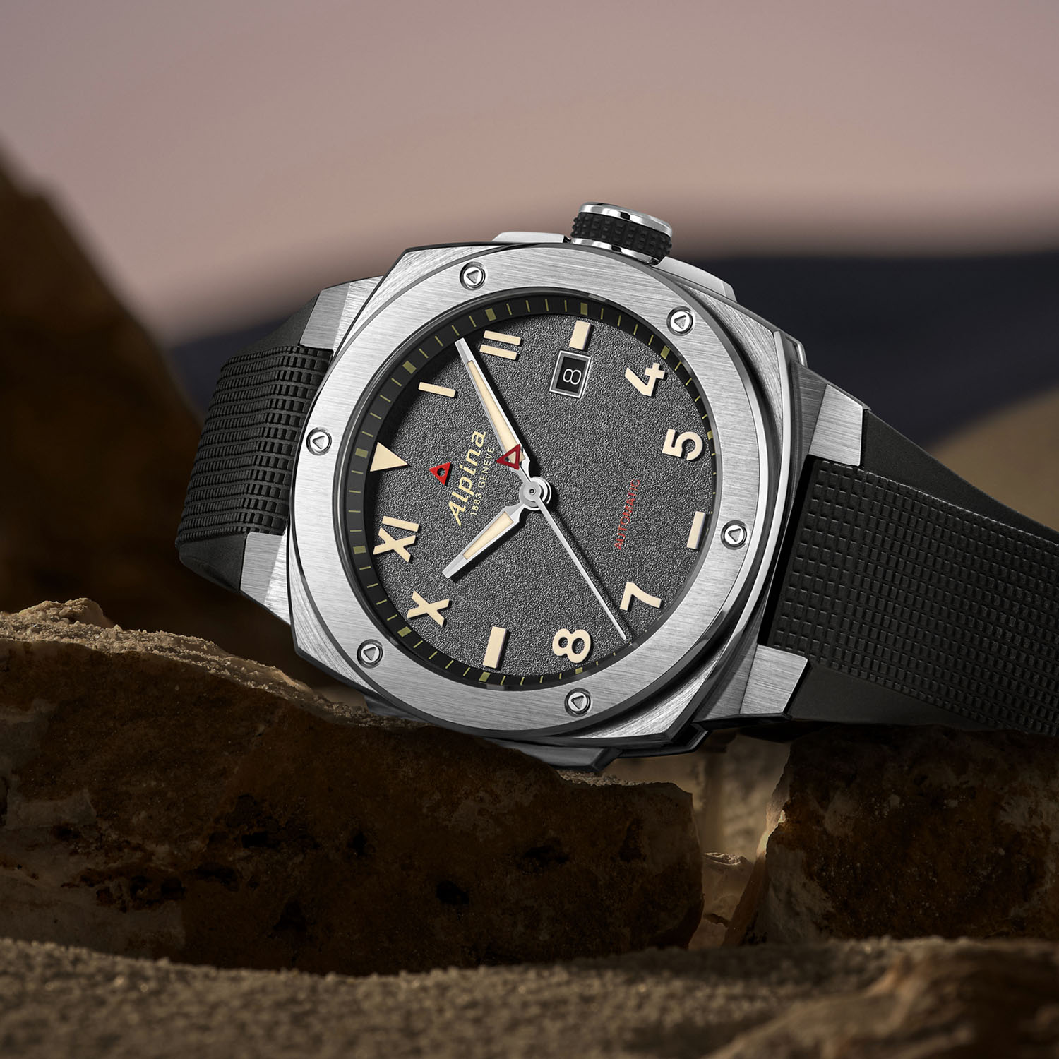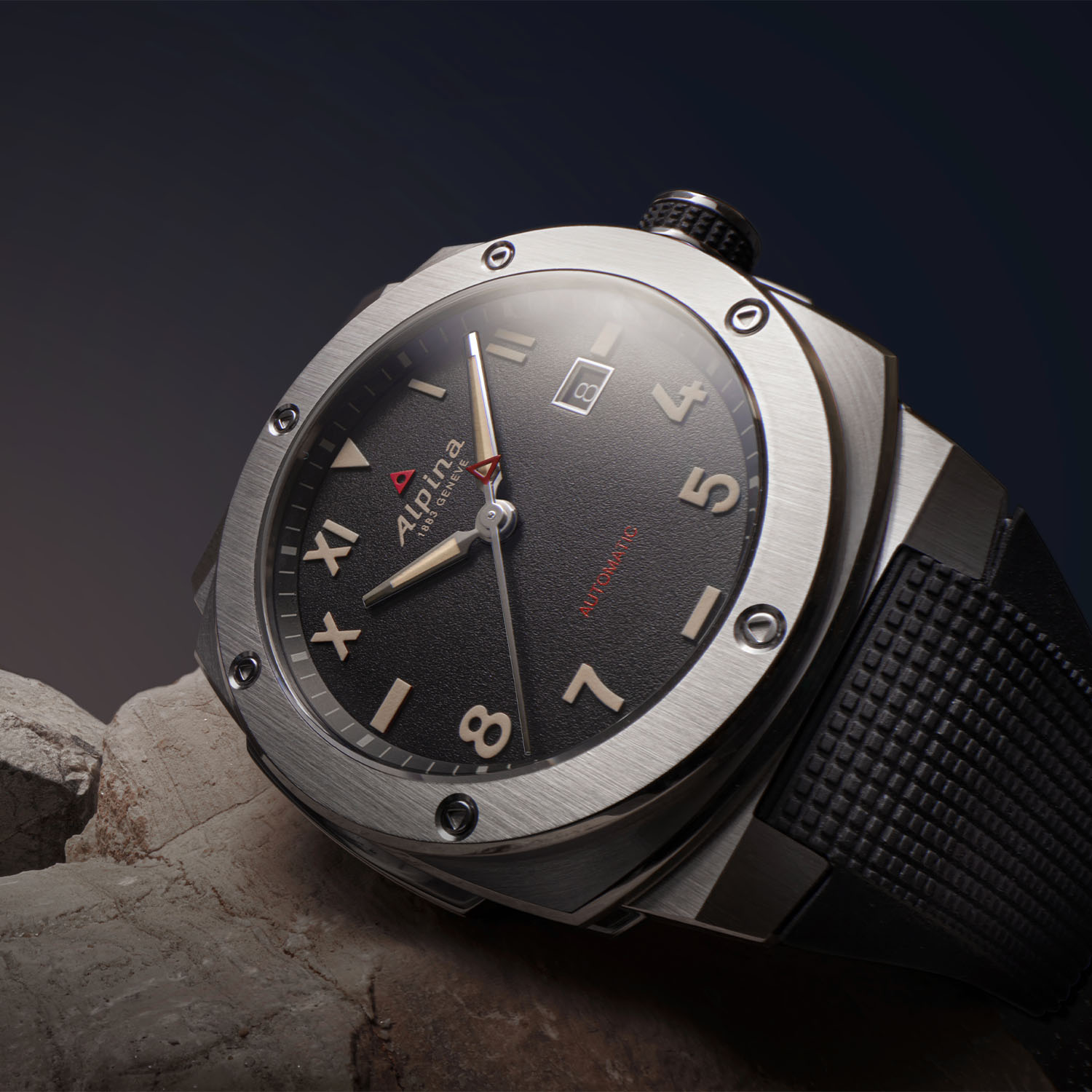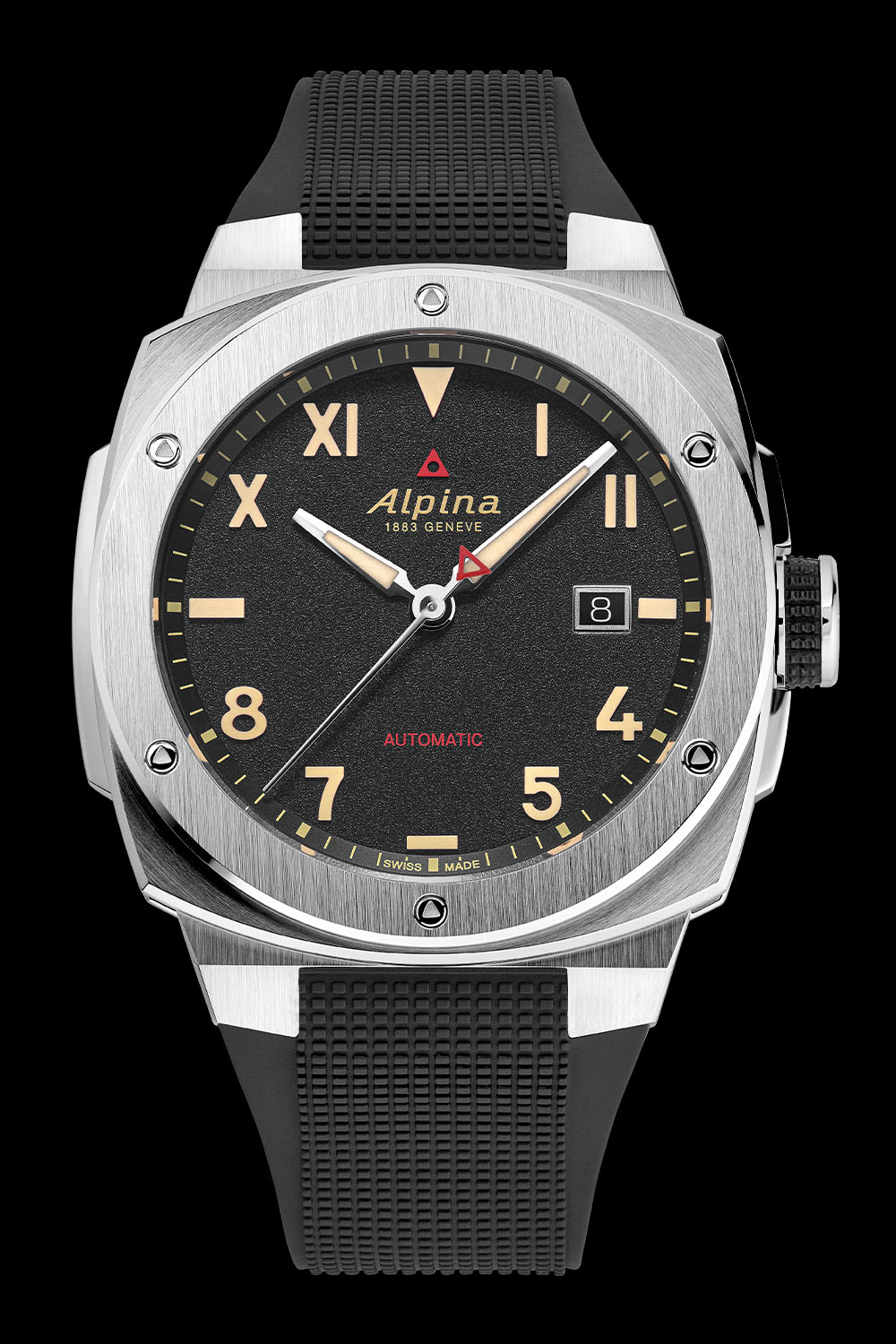 Revamped in 2022, the robust Alpiner Extreme Automatic has a three-part 41mm cushion-shaped case with a thickness of 11.5mm. Designed to endure knocks, blows and bad weather, there are protective bumpers on both sides of the case, and the screw-down rubber-clad crown ensures optimal grip and the 200m water-resistance. The angular case and round fixed bezel – secured by six screws with triangular heads (Alpina logo) – feature brushed surfaces for a sporty look with polished bevels to highlight the dynamic architecture. Underscoring the rugged sports watch vibe, the Alpiner Extreme comes with an integrated (looking) textured black rubber strap.