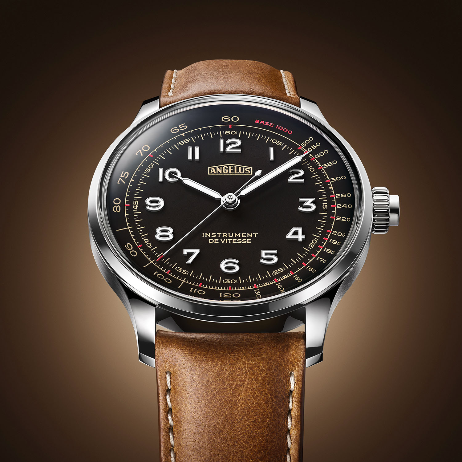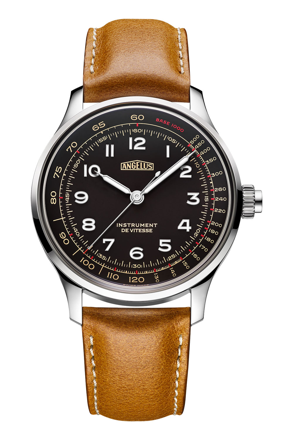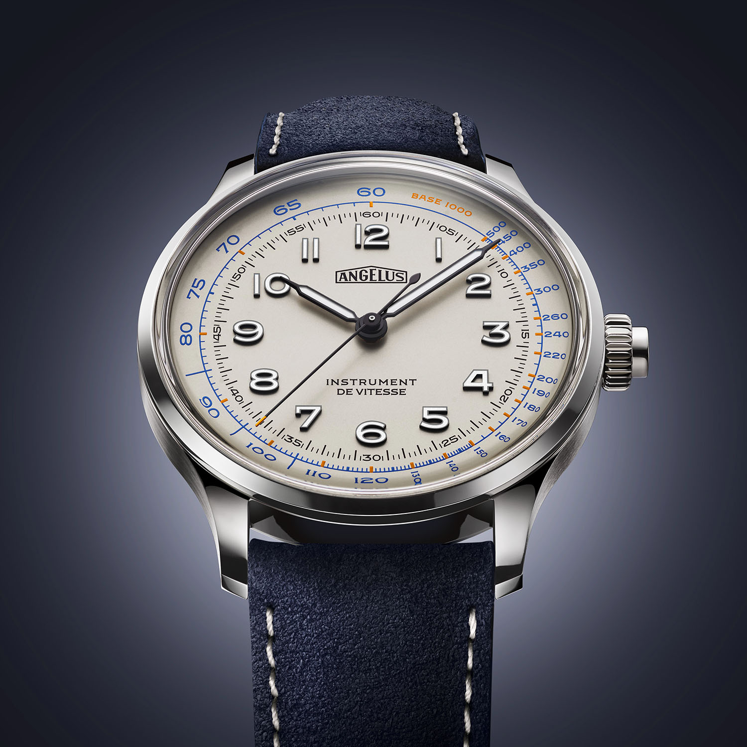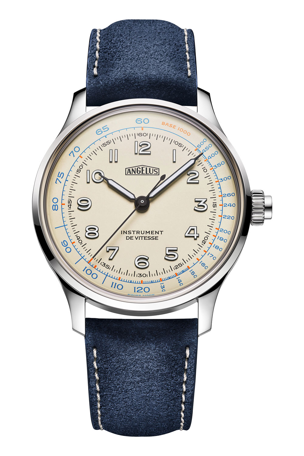 The new Angelus Instrument de Vitesse is worn on a hand-stitched caramel calfskin or midnight-blue nubuck calfskin strap, depending on the model, secured on the wrist with a steel pin buckle. The brand will make only 25 pieces of each dial variant; this exclusivity is further supported by a price of CHF 17,100 (taxes included). For more, visit angelus-watches.com.