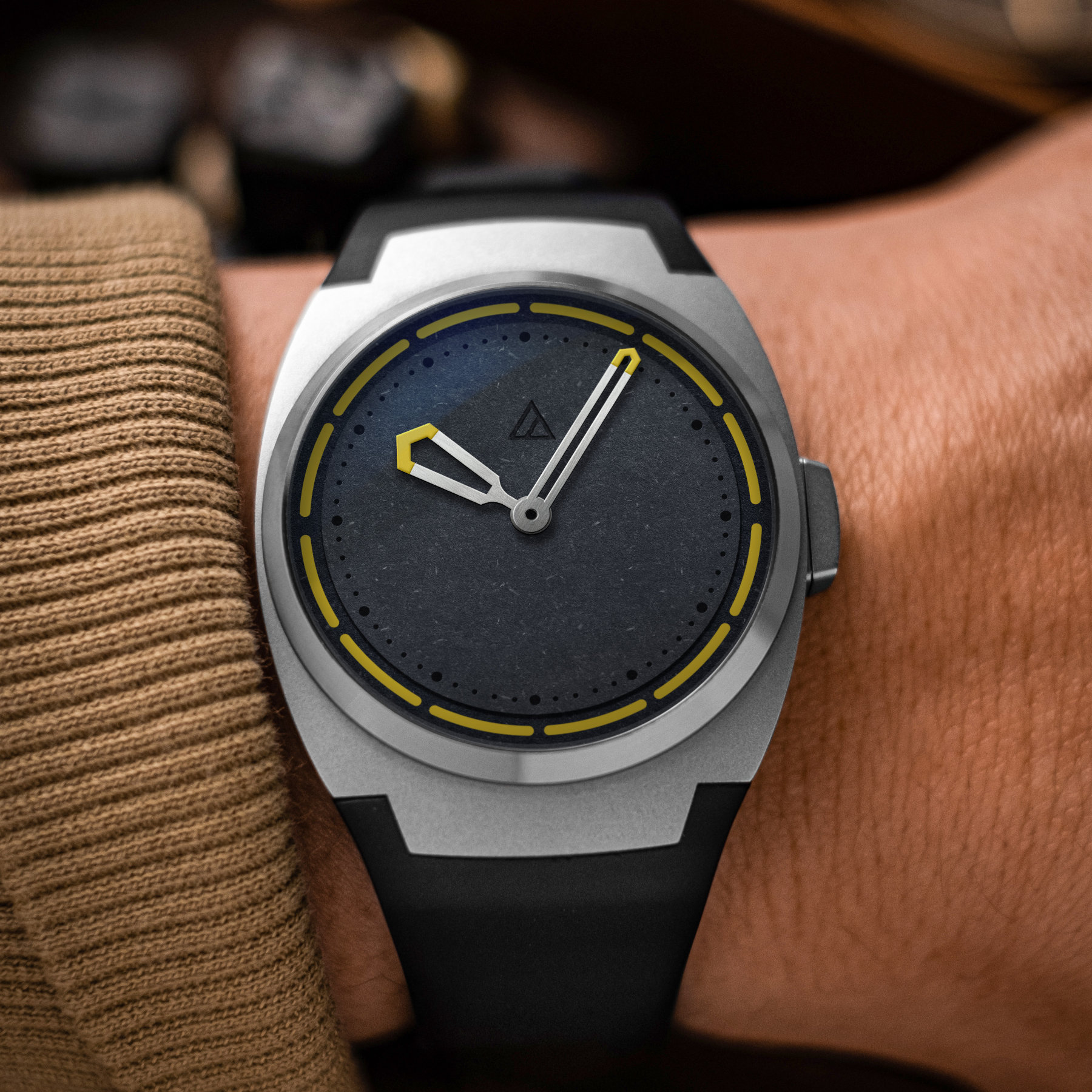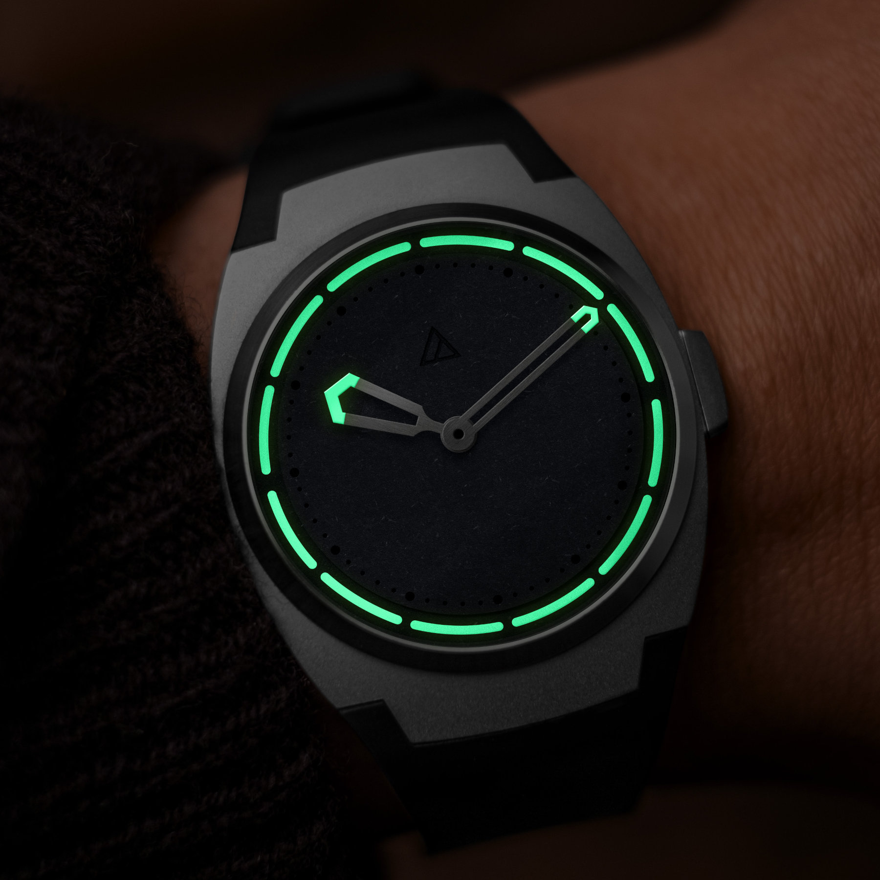 The dial is a special in-house composite that was conceived by co-owner James Thompson, a.k.a. Black Badger. It’s part of the collection’s name, D’Arc Matter, and involves Scandinavian slate from an old fountain that’s been ground to a fine powder and blended with an ultra-clear, UV-resistant resin. The resulting composite plates are then milled into dial blanks and given one of four proprietary Super-LumiNova colours around the perimeter and tips of the hour and minute hands. The lume is provided by RC Tritec AG and comes in Badger Blue, Gamma Green, Hornet Yellow and Pongo Orange. The indices are subtle as they’re punched just inside the Super-LumiNova patterns.