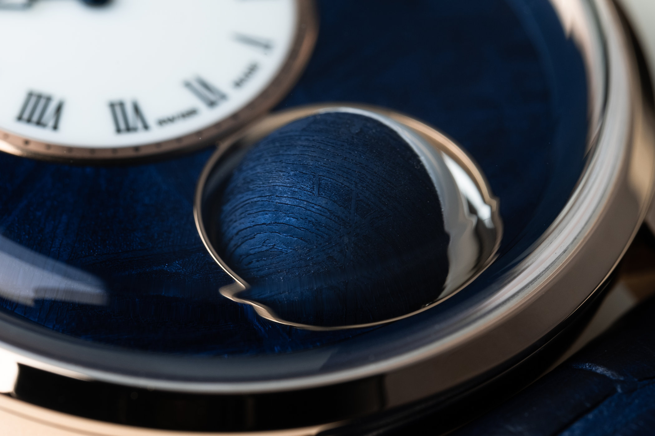 Half of the sphere representing the moon is made from Cacholong opal, and the other half is a blue PVD meteorite. Opal’s natural iridescence plays with the ambient light beautifully, but in low-light conditions, the dial and the opal half of the moon emit a blue-green glow thanks to the Super-LumiNova coating. Astronomical accuracy is guaranteed by the precision moon phase complication on the back of the movement that, if the watch were kept wound, would require an adjustment of only one day every 122 years. However, there is a practical way to correct the moon phases directly at the crown.