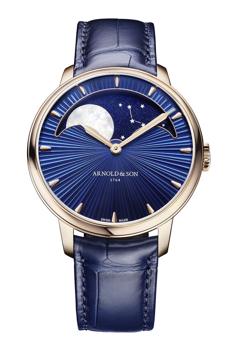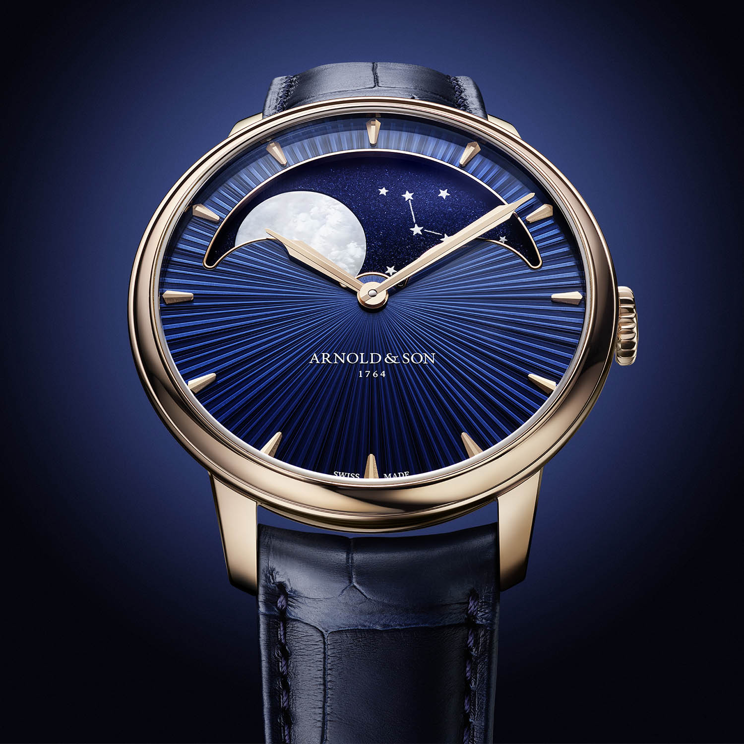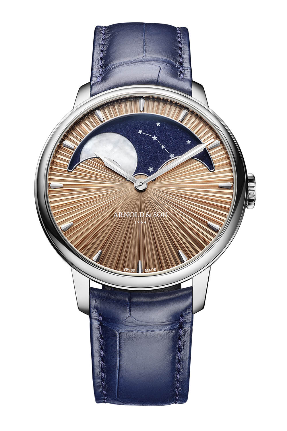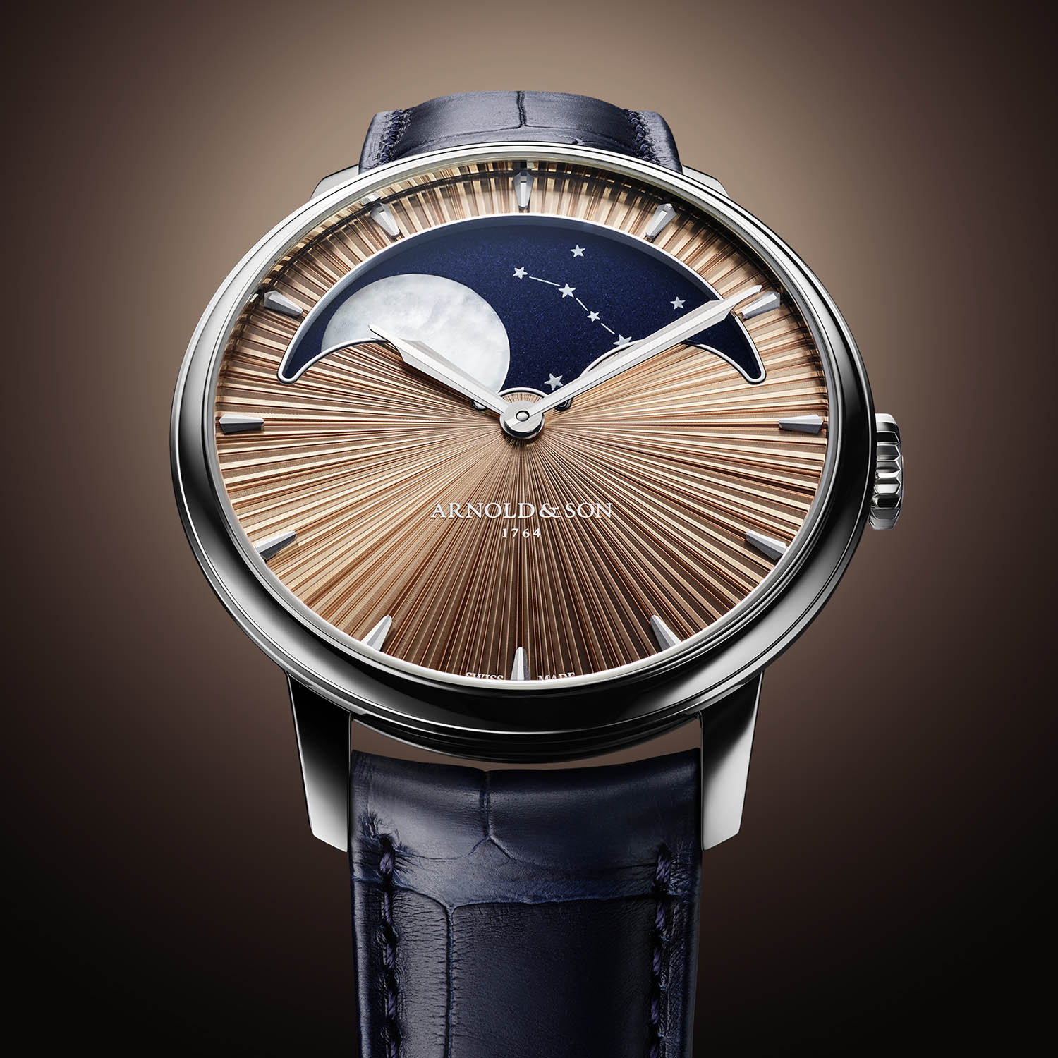 Beautiful dials with deep furrowed rays accompany the phases of Arnold & Son’s giant moon.