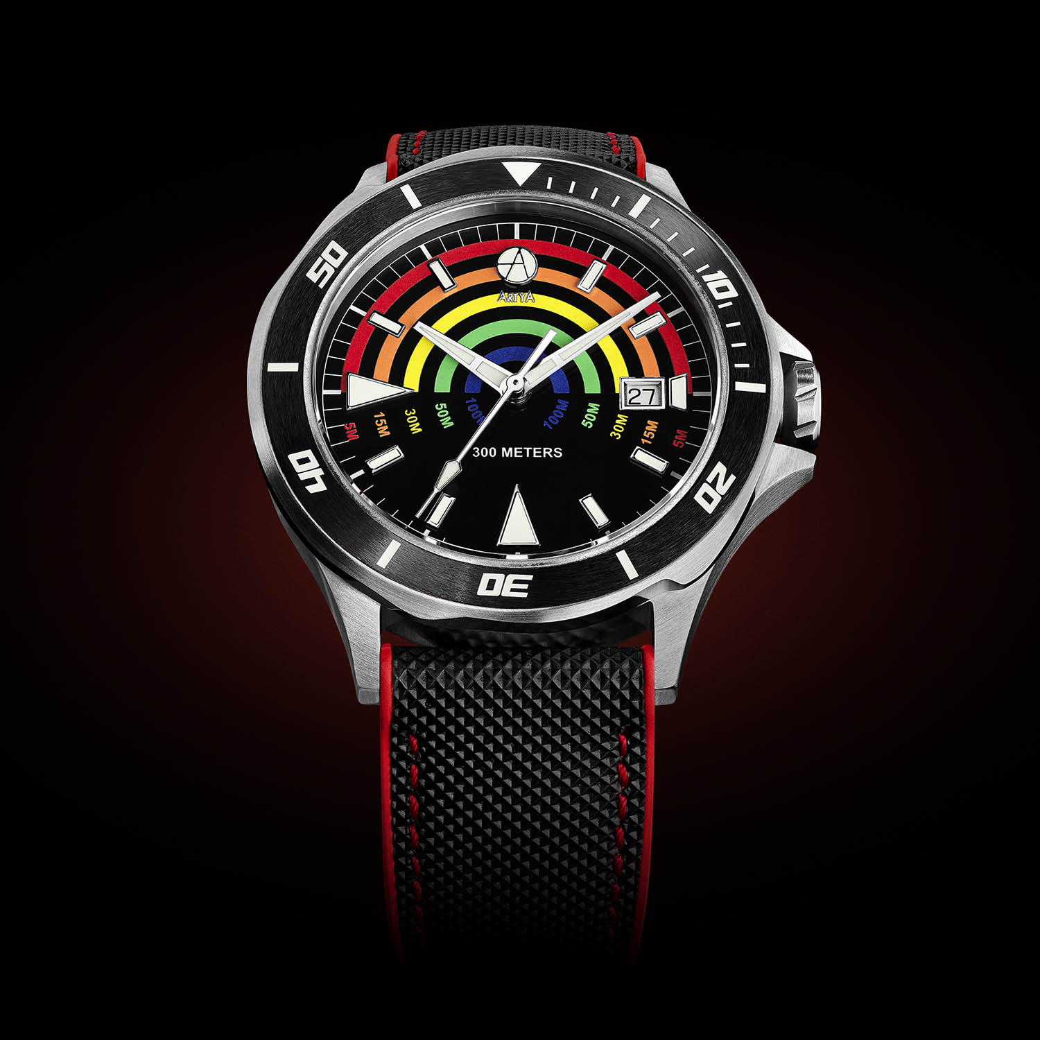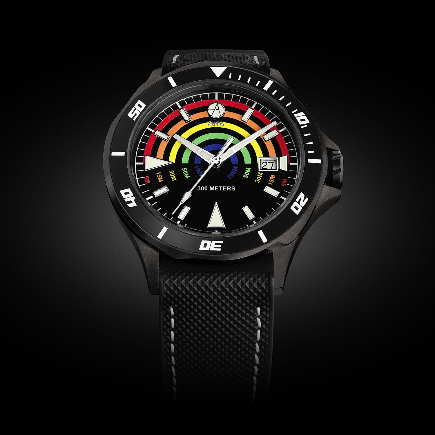So, what is the Artya Depth Gauge all about? Well, you’ll have to look at the dial, not at the classic black background or the applied markers and hands filled with BGW9 Super-LumiNova. No, what matters are the semi-circular coloured arches on the upper half. And no, these aren’t standard scales like the one on a Mido Ocean Star Decompression Timer; these coloured arches act as a depth gauge. But how, since there is no mechanical device to measure the depth? Well, you have to understand the science of chromatics and how colours act underwater.