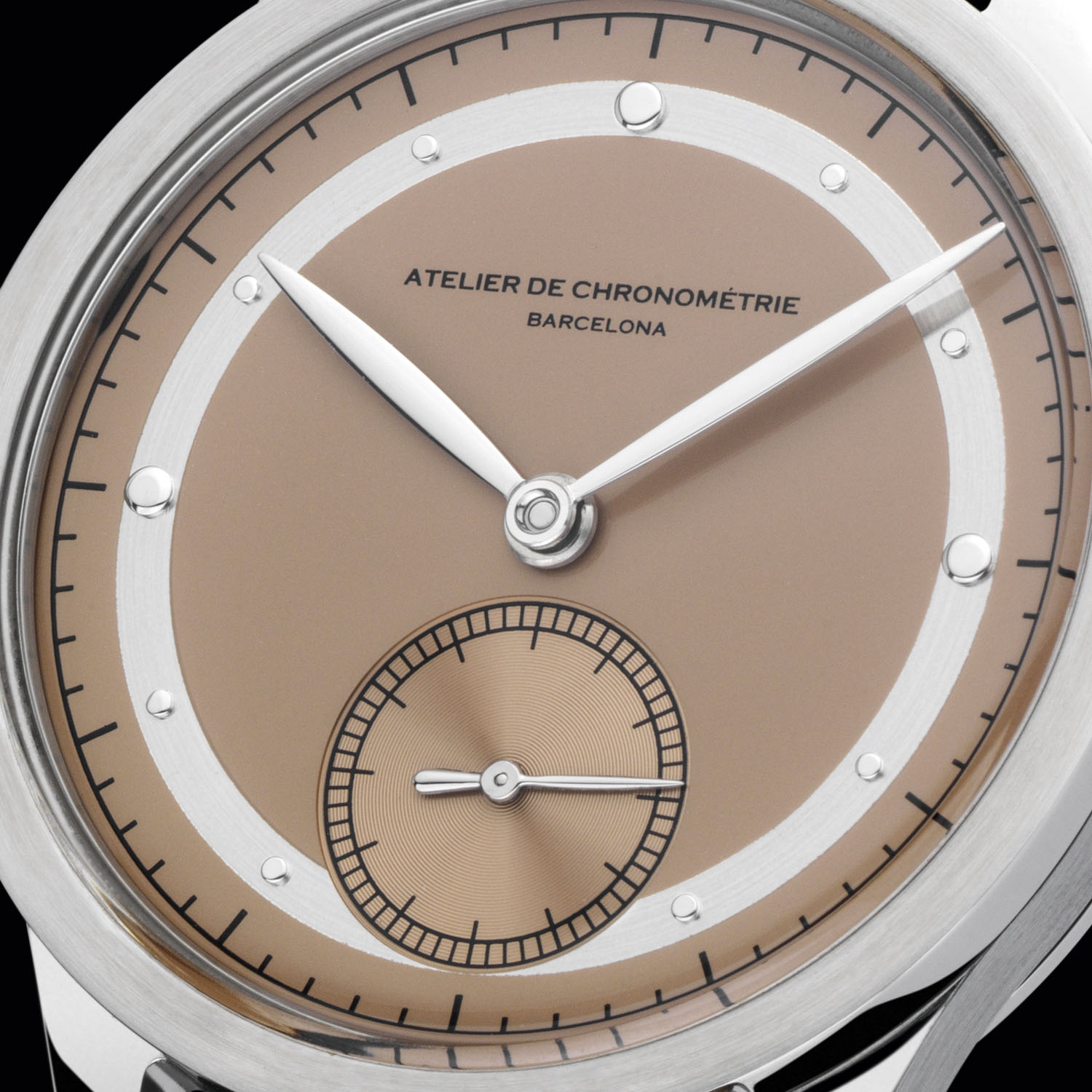 The way the movement is executed sets the mood for appreciating the AdC22 as a very handsome, intelligent piece, presented in a Calatrava-style stainless steel case with a 37.5mm diameter and a height of 9mm. The case is polished to reflect the light in the most flattering manner – and I love the handmade crown without any logo. The dial is two-tone, predominantly rose/salmon, with a galvanic silver ring bearing applied circular hour indices, with a recessed (engine-turned) sub-dial at 6 o’clock for the small seconds. The minutes and seconds tracks are printed in black, legible and modest so as not to violate the rose-and-silver harmony, with polished stainless steel hands completing the perfect image of this vintage-inspired yet contemporary model.
