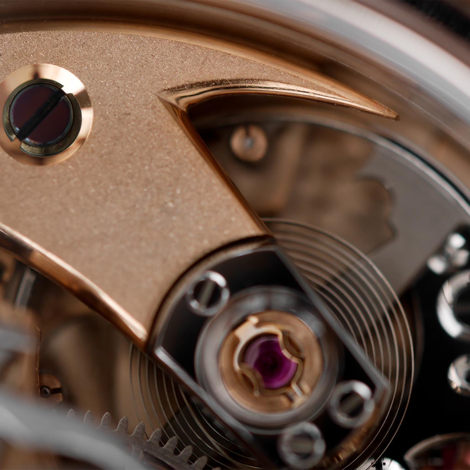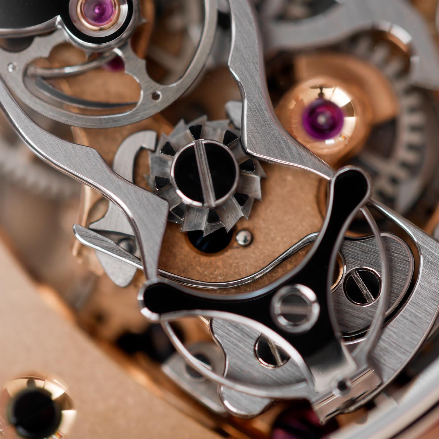The pièce de résistance is the decoration of the movement. True Haute Horlogerie finishing is applied to every single part. The plate and bridges have a grainage finish and are 18k pink gold-plated. All the edges are bevelled and polished, the countersinks are polished and there are etirages des flancs (straight graining). Purple black polished and bevelled screws are visible too. Steel parts are either black polished with anglage or straight-grained (chronograph levers). The anchor bridge is made of steel and black polished, and so is the rattrapante bridge with its 18k pink gold chaton. The wheels have been rhodium-plated and decorated with anglage and circular satin-finished. Finally, the movement is equipped with a free-sprung balance regulated by 6 masselottes made in 18k rose gold with a black polished stud holder plate, and a rattrapante wheel made of titanium with the AdC symbol.