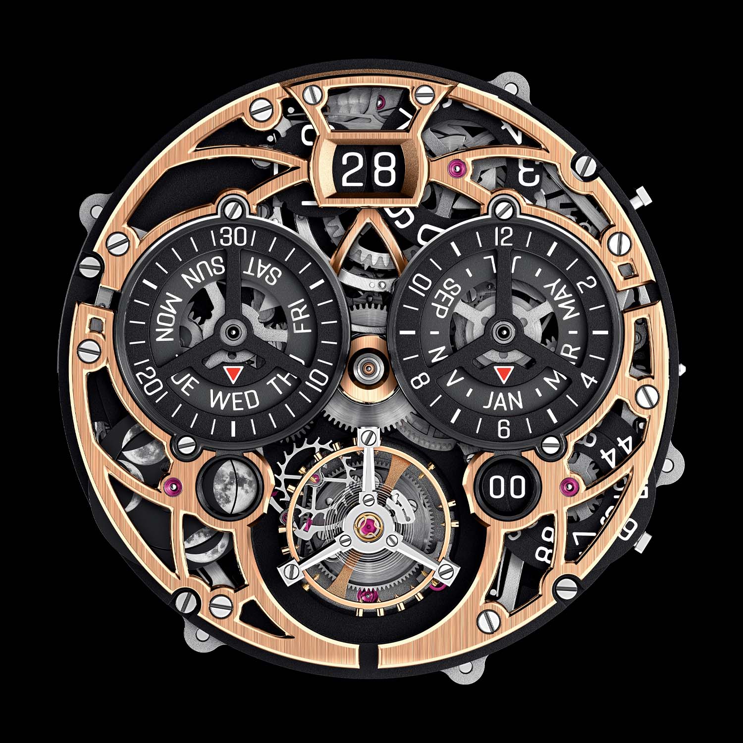 The left side features a pusher to start the minute repeater and two correctors for the moon and day indications. Three crowns on the right side with coaxial pushers allow the wearer to wind the watch, set the time and date with the central crown and select the chiming mode (Grande Sonnerie, Petite Sonnerie or silence mode). The flyback chronograph can be started and stopped with the supercrown at 2 o’clock and reset with the other supercrown at 4 o’clock. The 4 o’clock crown also corrects the month in sync with the year.