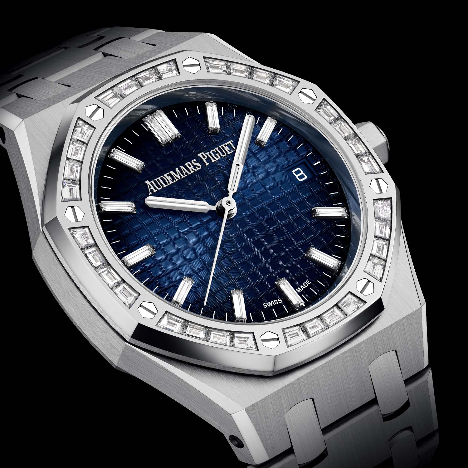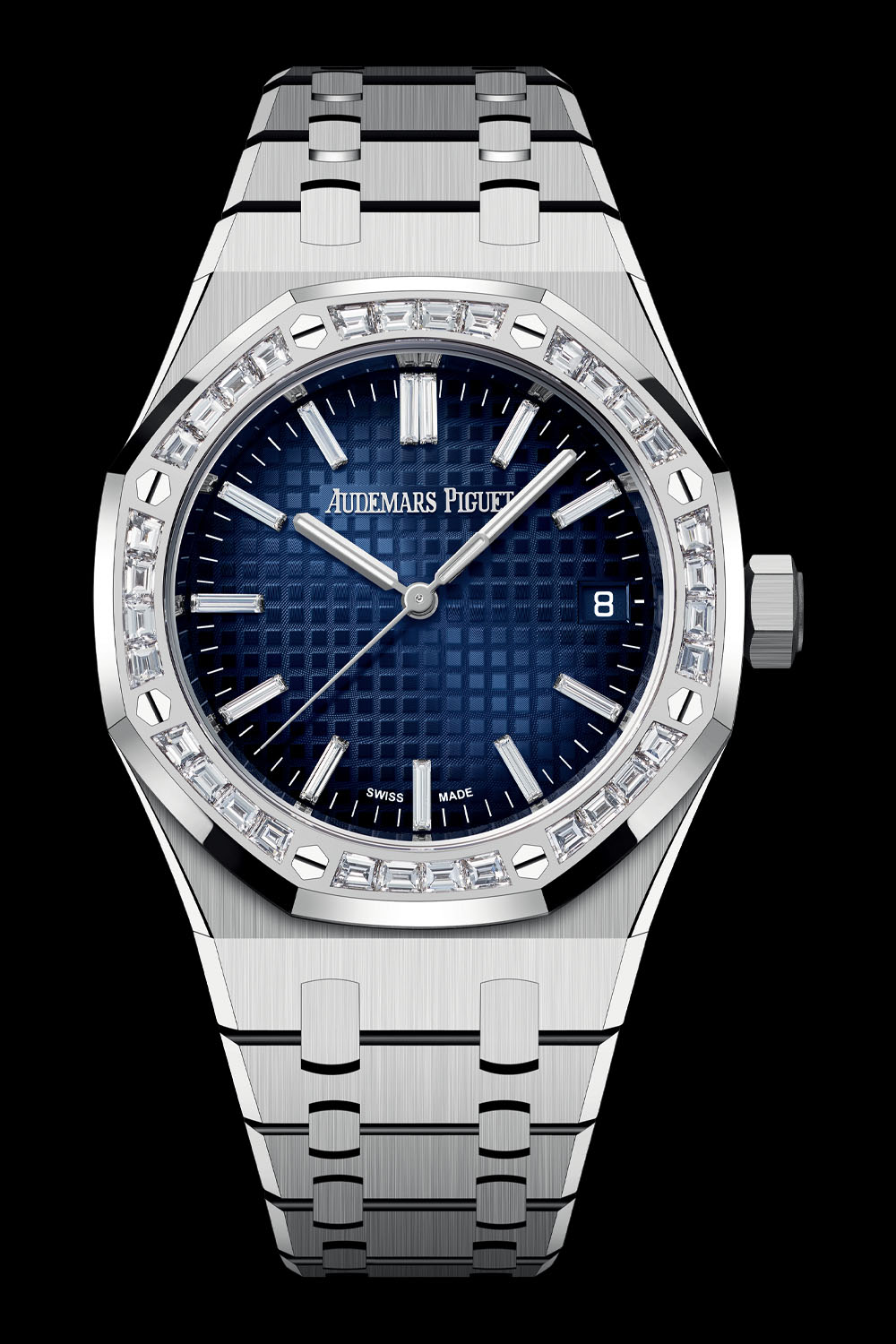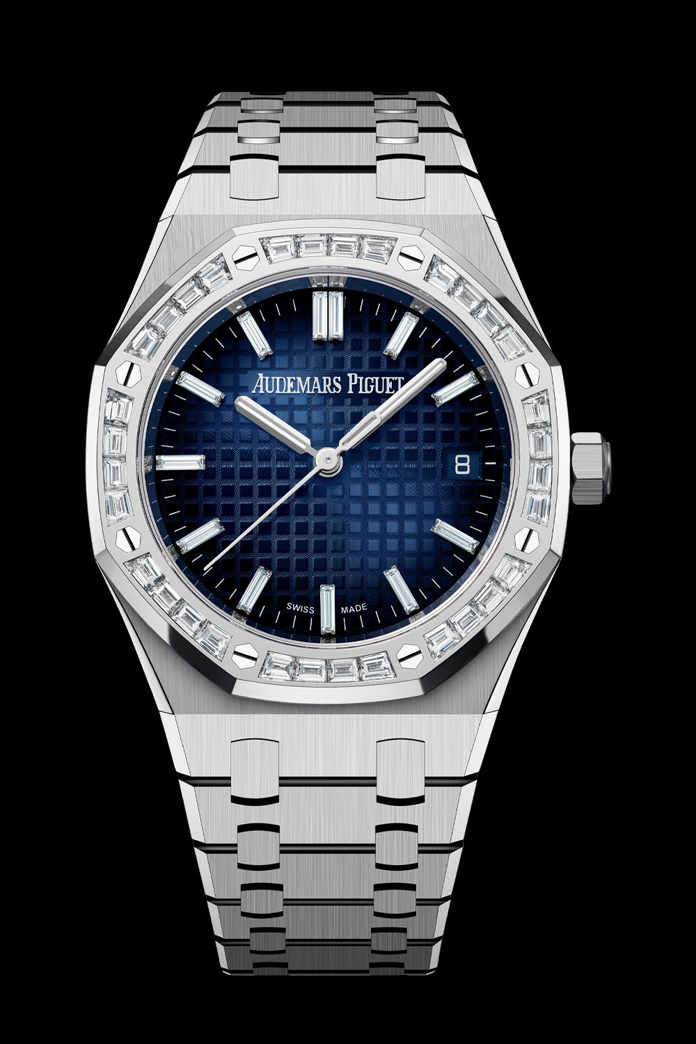 More compact editions of the Royal Oak Selfwinding get new blue gradient dials and an infusion of lights thanks to the baguette-cut diamonds on the bezel and dial.