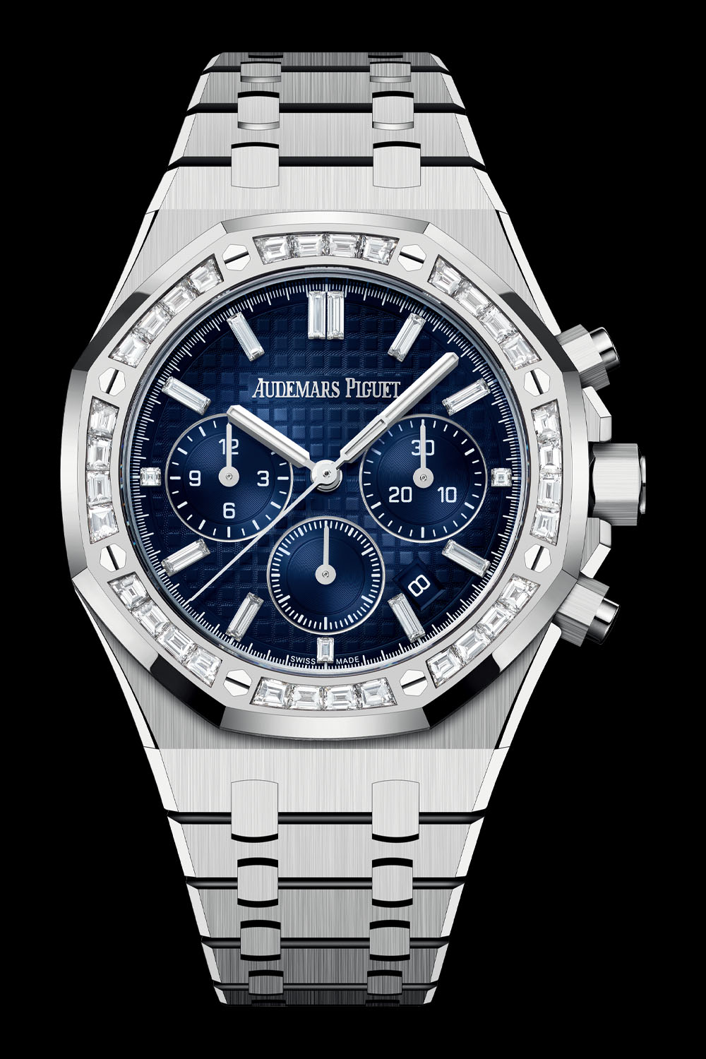 Quick facts: Royal Oak Selfwinding Chronograph 38mm ref. 26715BC.ZZ.1356BC.01 – 38mm x 11mm – 18k white gold case, polished and brushed – 32 baguette-cut diamonds set in bezel – glare-proofed sapphire crystal front and back – 50m water-resistance – gradient blue dial with Grand Tapisserie pattern – baguette-cut diamond hour markers – white gold Royal Oak hands with luminescence – blue snailed counters – tone-on-tone date window at 4:30h – automatic integrated column-wheel chronograph calibre 2385 by Piguet – 3Hz – 40h power reserve – 18k white gold bracelet with AP folding clasp – Price upon request (in excess of 100k)