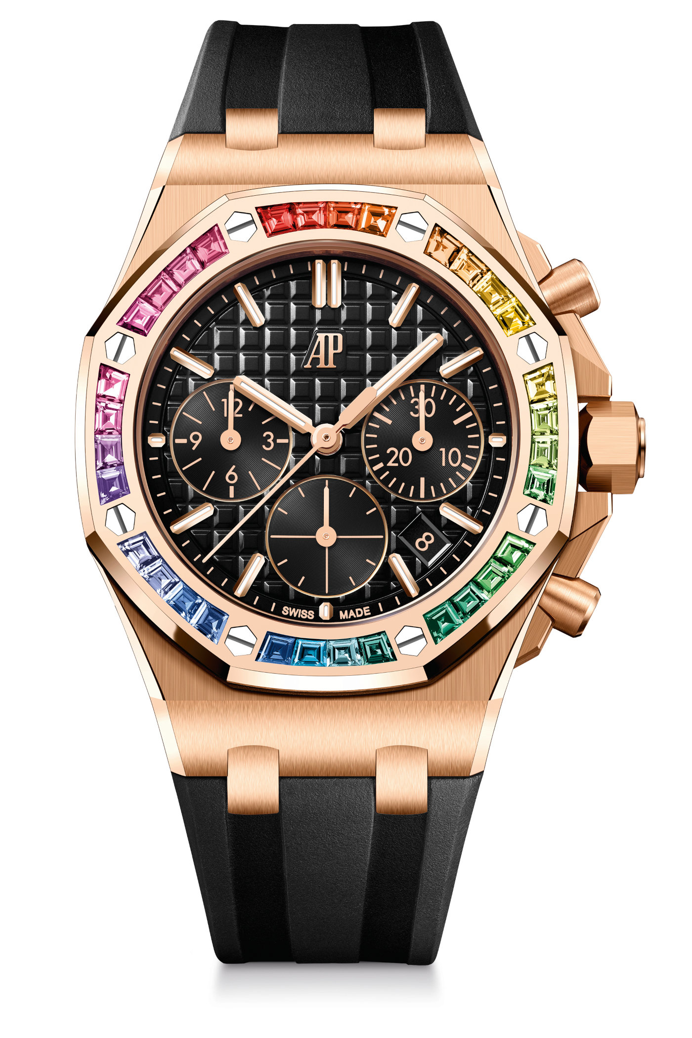 The rubber straps accompanying the watches come with a second rubber strap in a different colour and are fitted with a folding clasp matching the case material and AP’s interchangeable system.