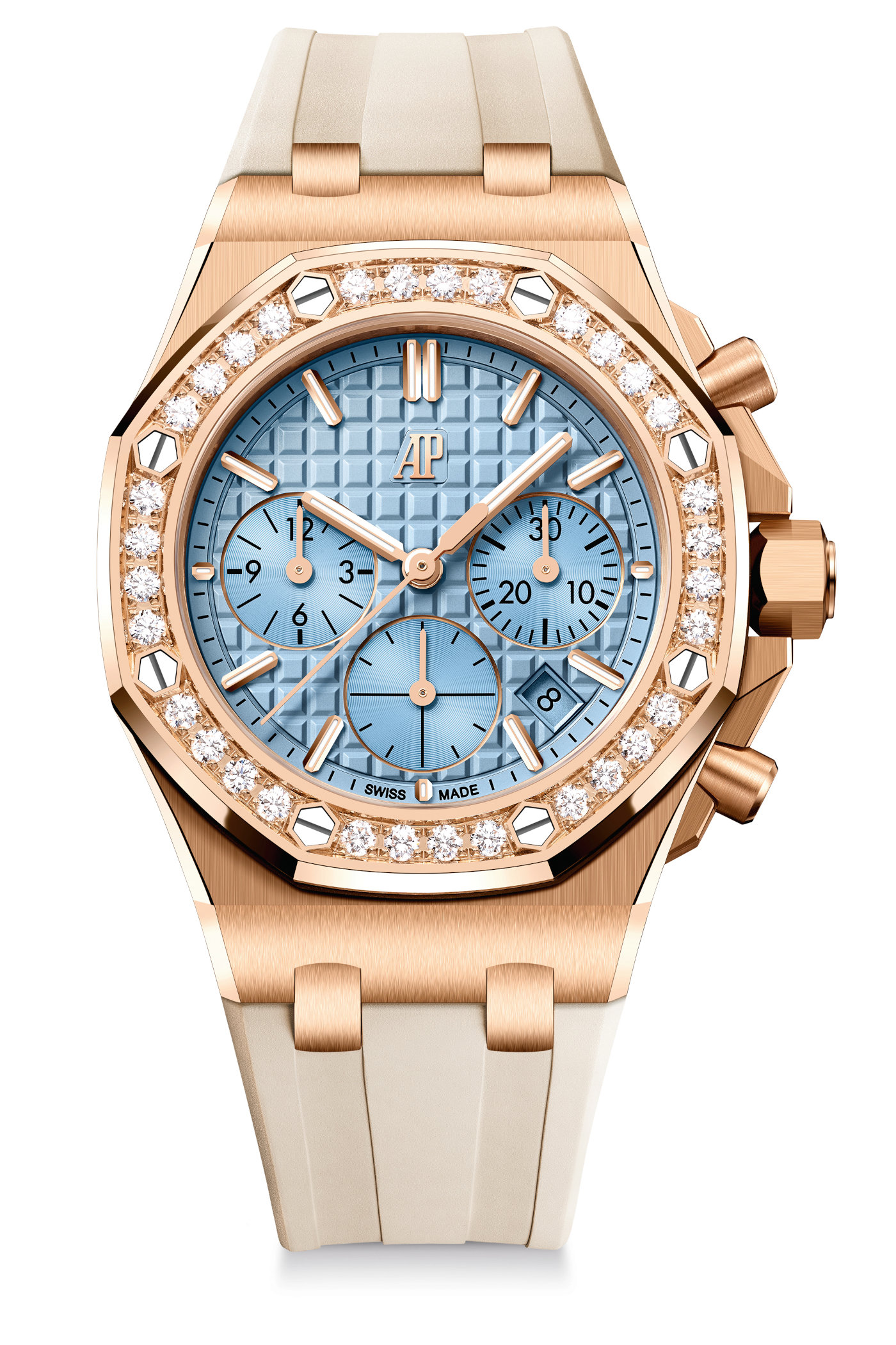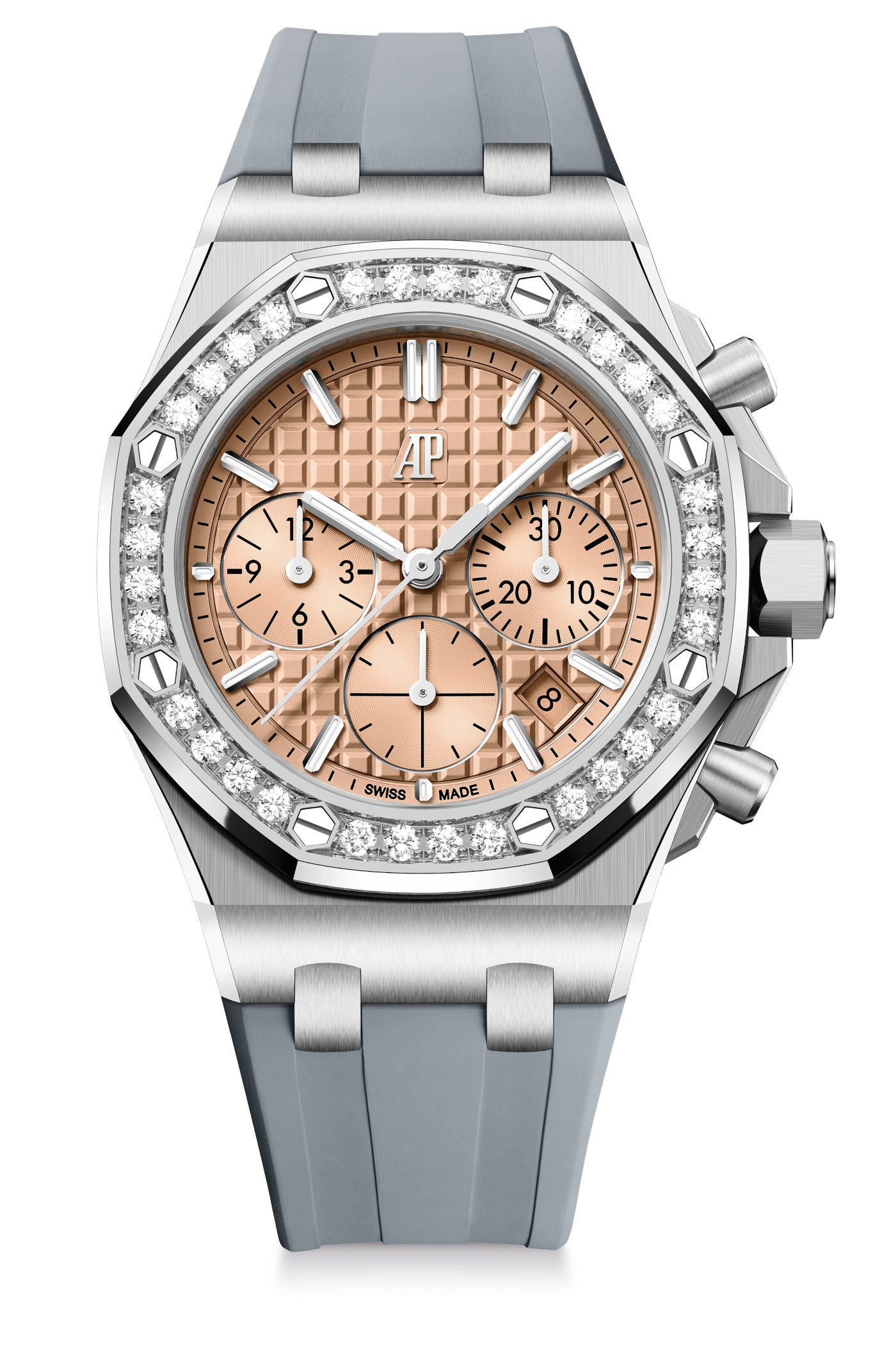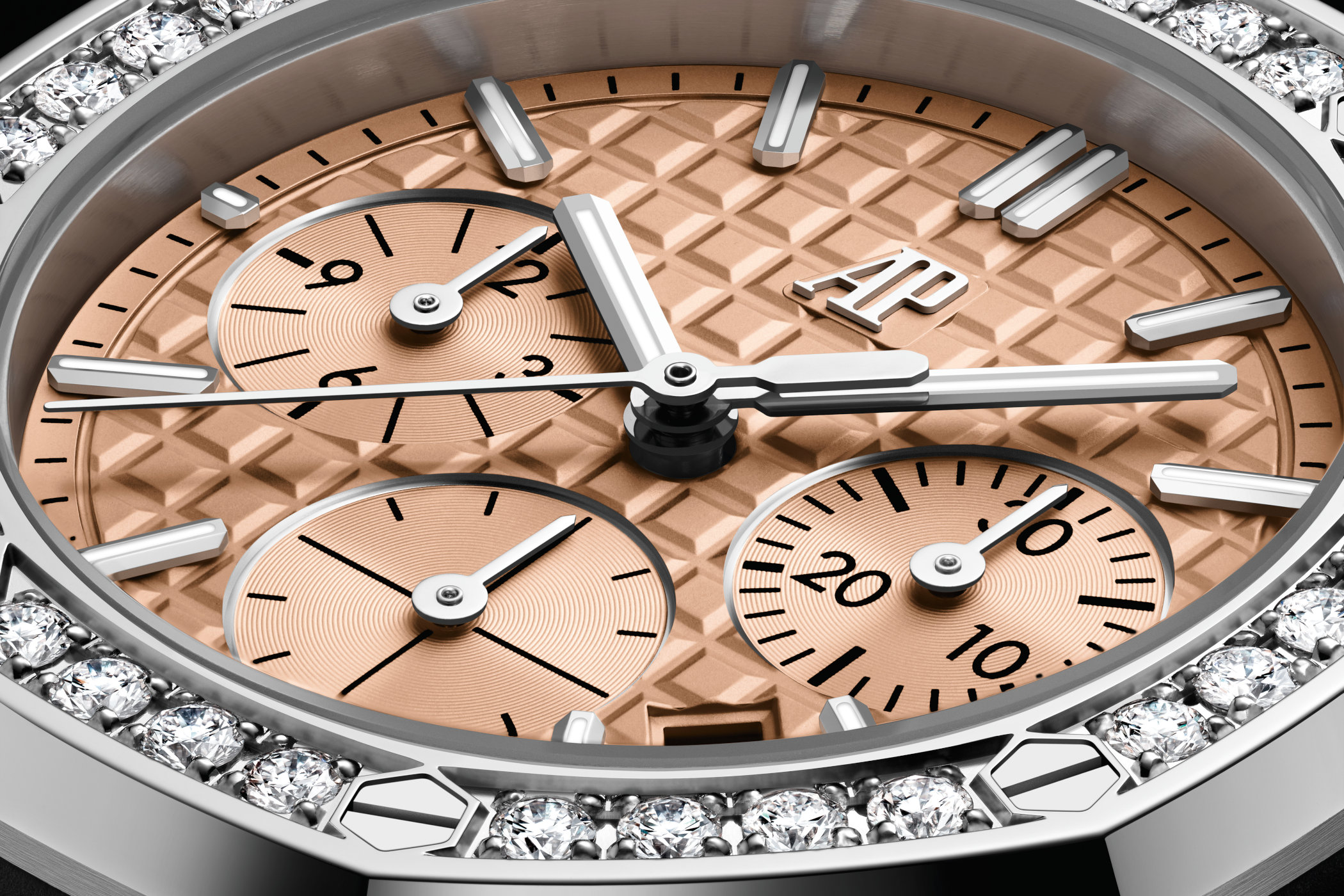 Following the evolution of the ROO Chronograph in 43mm, AP has decided it’s time for the 37mm to get a subtle design makeover. Novelties include the new Lady Tapisserie motif on the dial with slightly wider truncated pyramids than on previous editions, the elimination of the snailed decoration on the chapter ring and the incorporation of the new AP monogram at noon replacing the transferred Audemars Piguet signature of earlier versions. The applied gold hour markers are also slightly more prominent and, like the gold Royal Oak hour and minute hands, are treated with luminescent coating. Thankfully, the background colour of the date window, lodged between the indices at 4 and 5 o’clock, matches the colour of the dial.