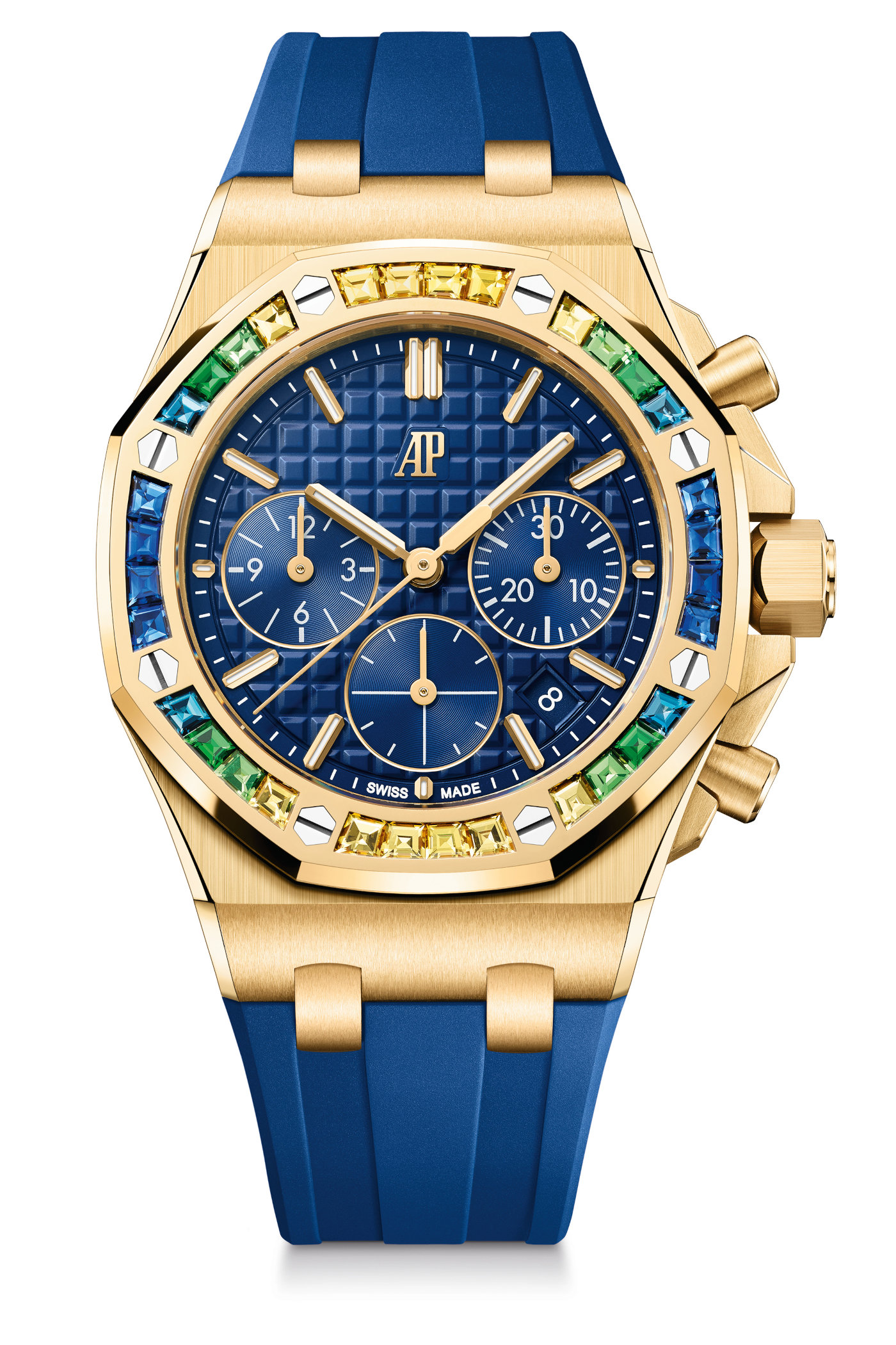 To mark the 20th anniversary of the Royal Oak in 1993, Audemars Piguet launched a beefier, more virile, ultra-robust version known as the Royal Oak Offshore. With its gigantic – at that time – 42mm diameter and bold combinations of materials, the Royal Oak Offshore was referred to as “The Beast”. Over the years, the Royal Oak Offshore has adapted to unisex market trends and is now offered in a wide range of sizes. The latest dispatch is four 37mm Royal Oak Offshore Selfwinding Chronographs attracting the limelight thanks to their vibrant coloured gemstone or icy white diamond-set bezels. Conforming to the recent overhaul of the family, the quartet of chronographs also flaunt a new Lady Tapisserie motif and subtle design tweaks on the dial.
