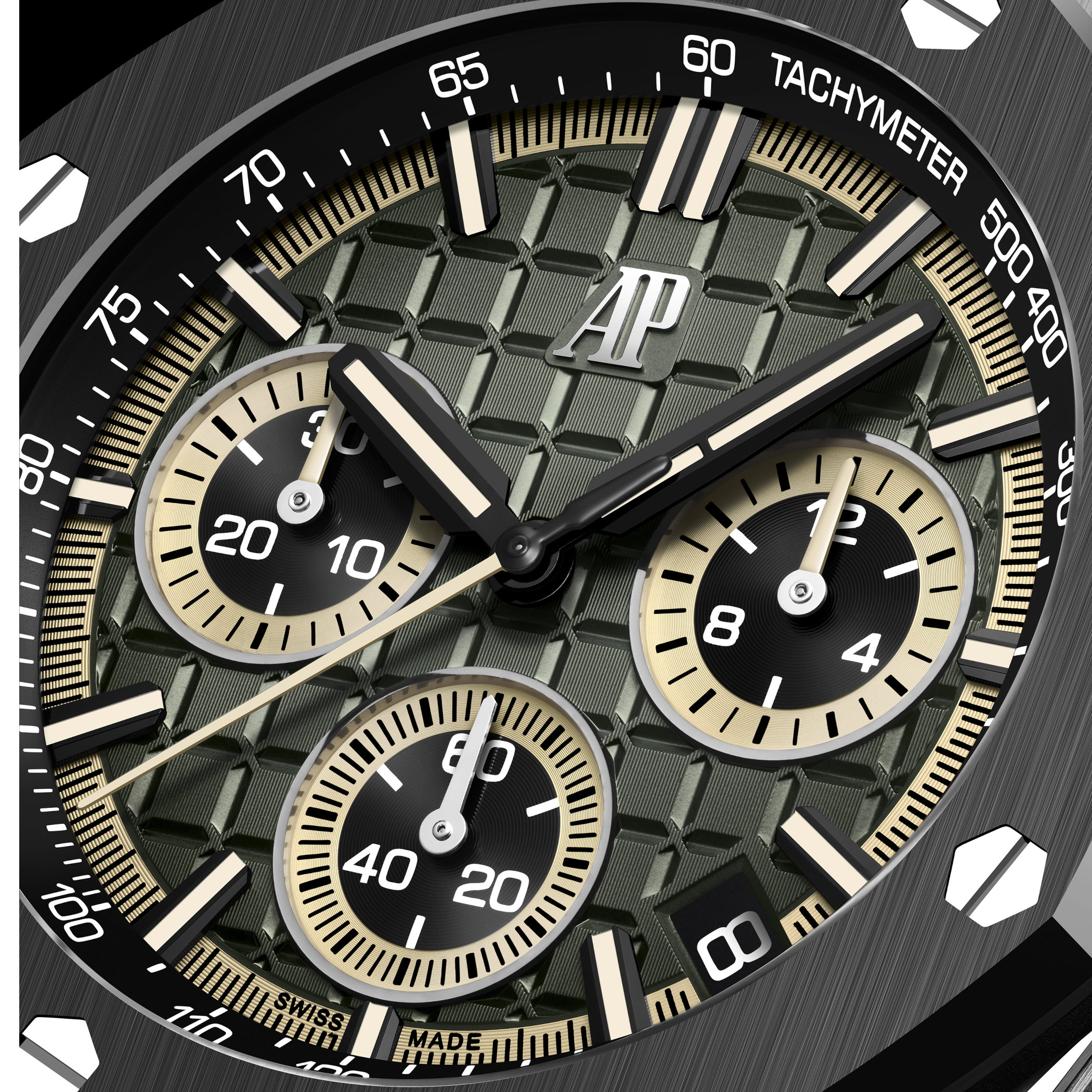 Both watches are powered by Audemars Piguet’s calibre 4401, visible through the sapphire caseback. This modern integrated flyback chronograph features a column wheel and vertical clutch, enabling smooth chronograph engagement and instant flyback. Beating at 28,800 vibrations/hour and offering a 70-hour power reserve, the movement is finished to Haute Horlogerie standards, with Côtes de Genève, polished bevels and a blackened oscillating weight.