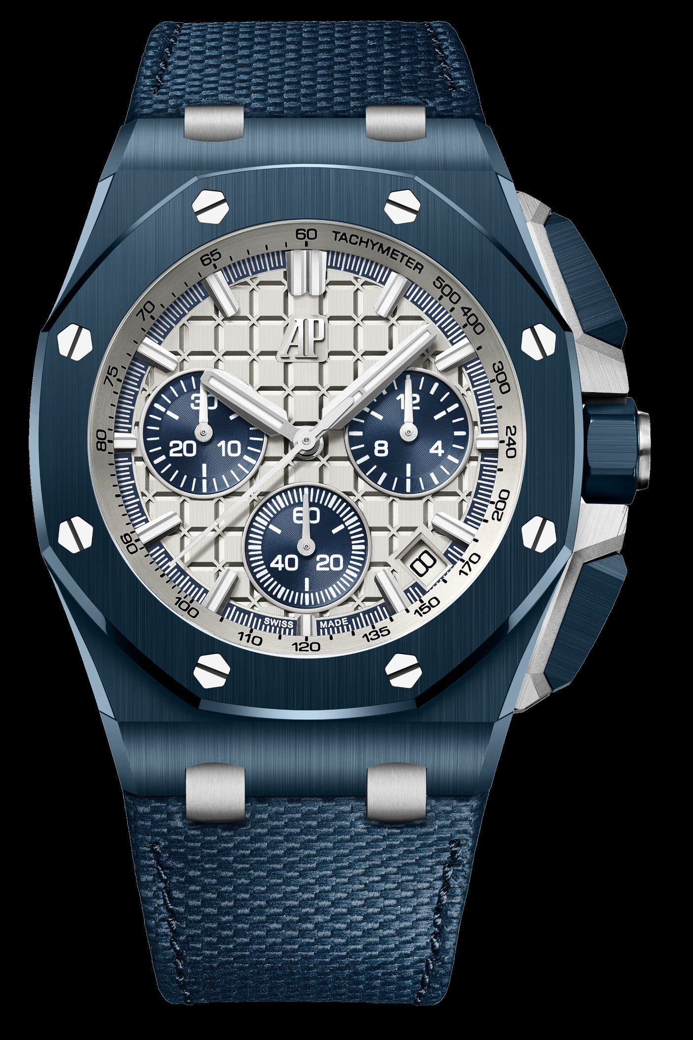 At the time of writing, prices for these new Royal Oak Offshore Chronograph models are CHF 36,800 in titanium and black ceramic, or CHF 50,900 in “Bleu Nuit, Nuage 50” ceramic.