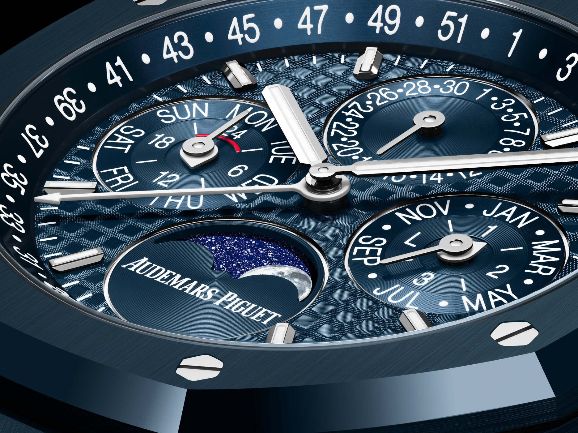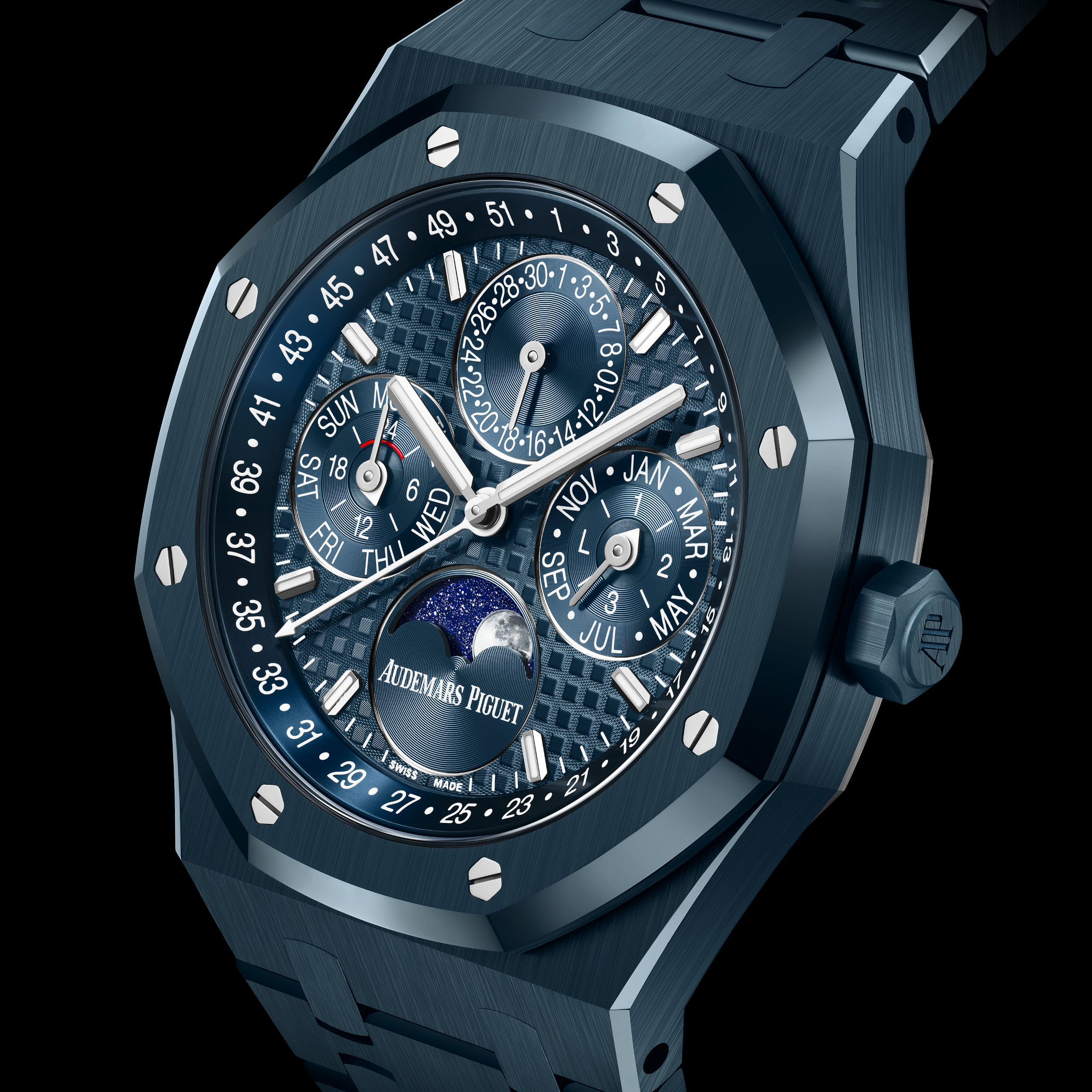The 41mm case and integrated bracelet are made from this deep blue ceramic, combining lightness, scratch resistance and exceptional durability. As with all ceramic Royal Oaks, the challenge was in achieving a perfectly homogeneous colour, but also in preserving the sharp geometry and alternating finishes that define the design. At 9.5mm thick, the case remains impressively slim for a perpetual calendar, with wearing comfort provided by the low weight of ceramic. Water-resistance is 50m, a welcome upgrade over previous generations.