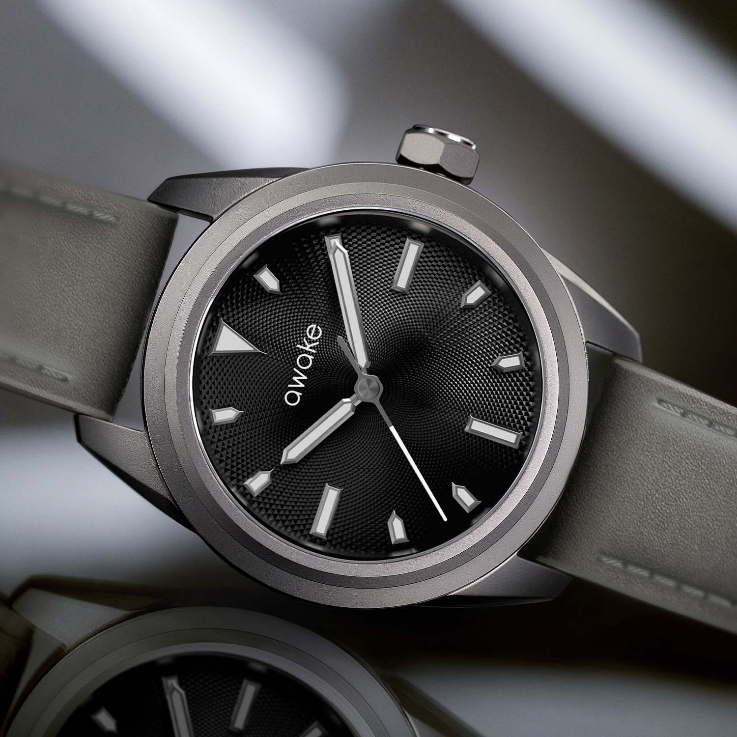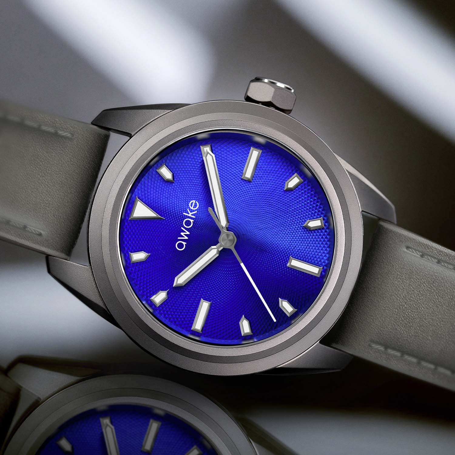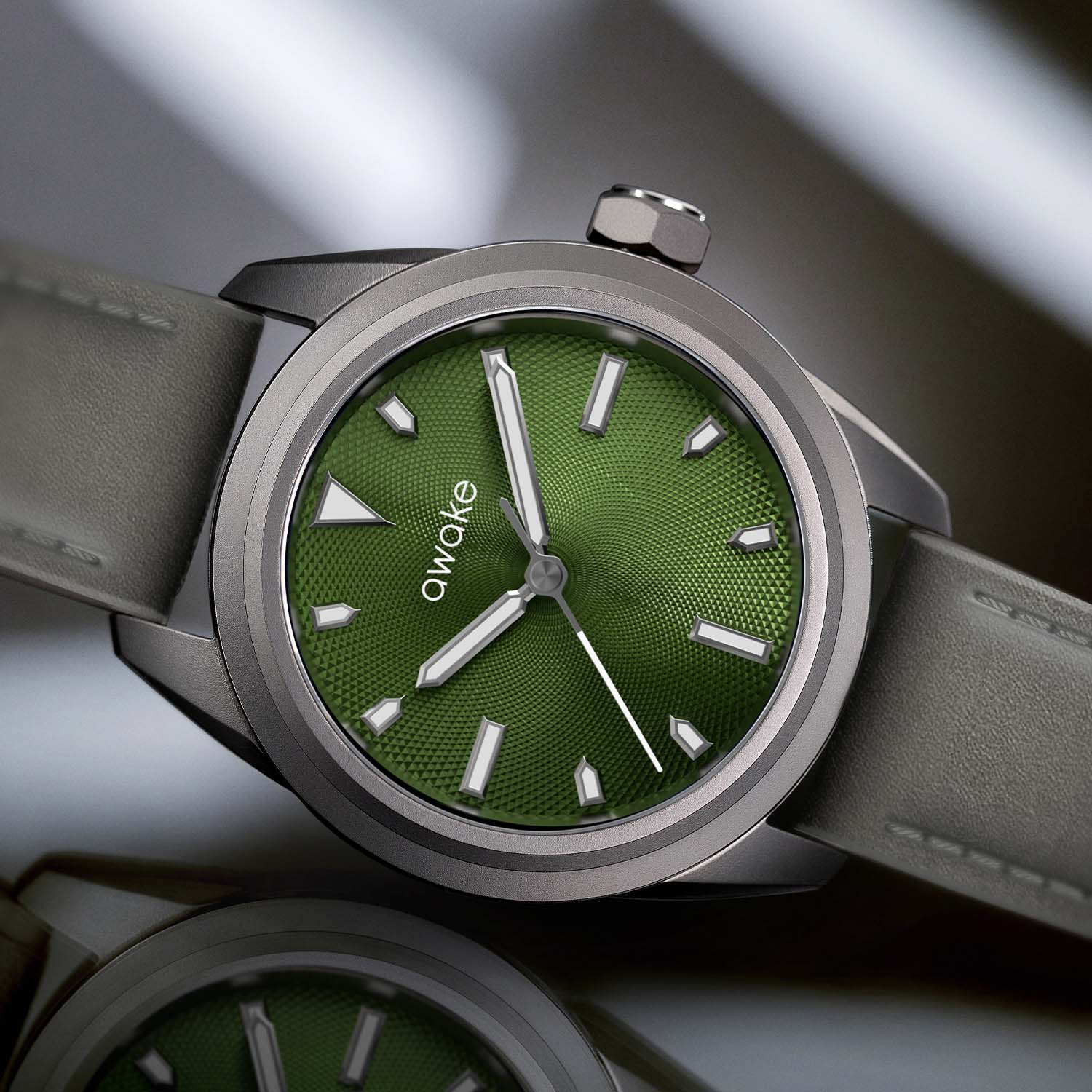 For the rest, these watches remain almost identical to all previous creations of Awake, with a sleek, minimalistic case measuring 40mm in diameter and 11.9mm in height. Made of recycled titanium with matte surfaces, it remains discreet so the focus is on the dial, its colours and textures. The watch is equipped with a sapphire crystal, a see-through caseback and a screw-down crown. Water-resistance is rated at 100m. The dials are completed by sharp faceted hands and markers, with a generous amount of luminscent material.
