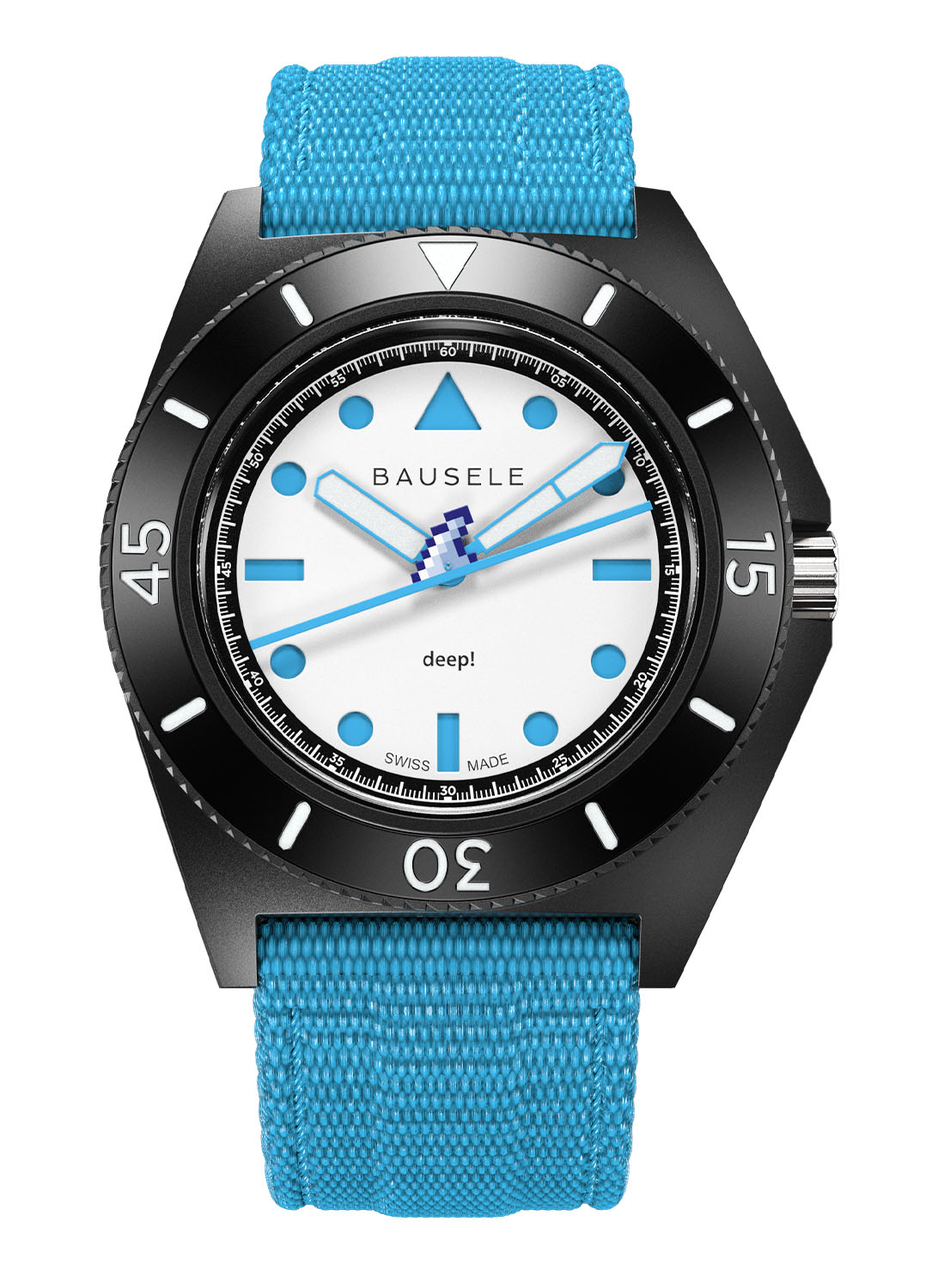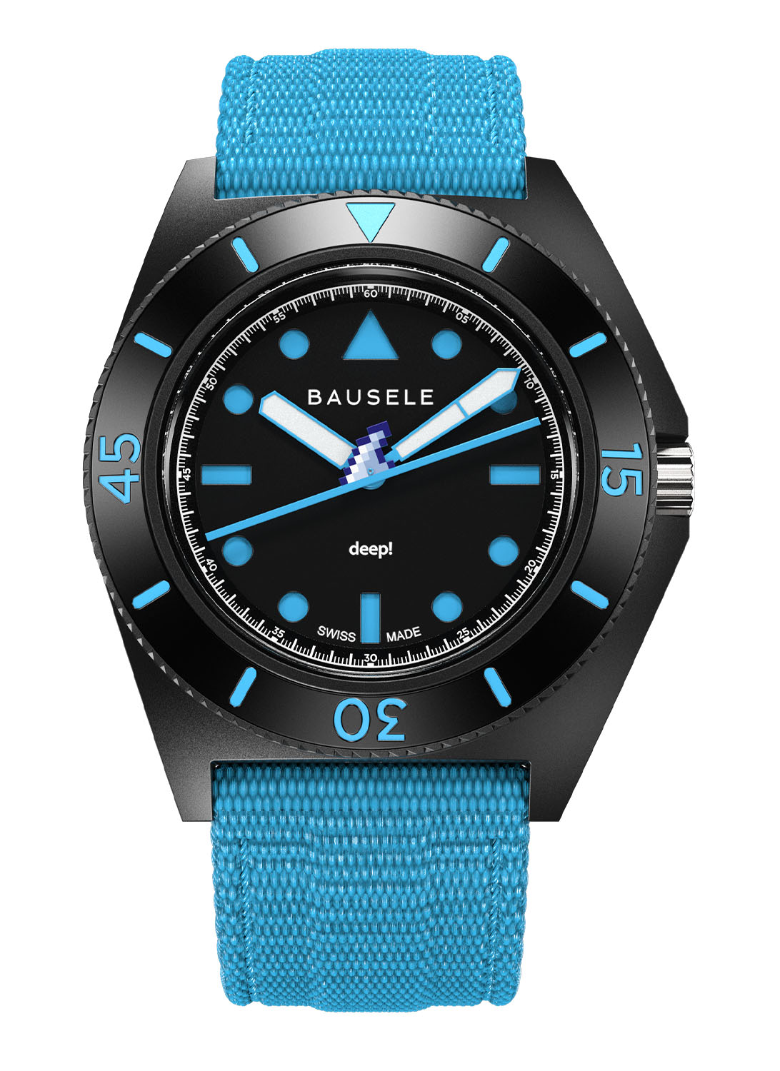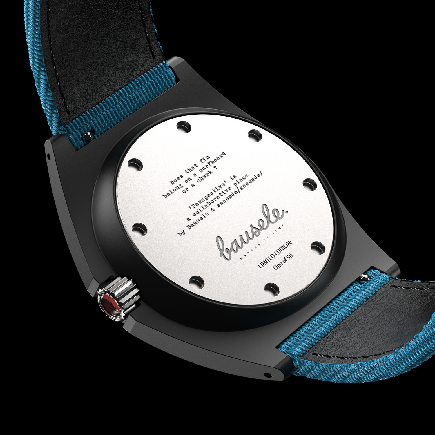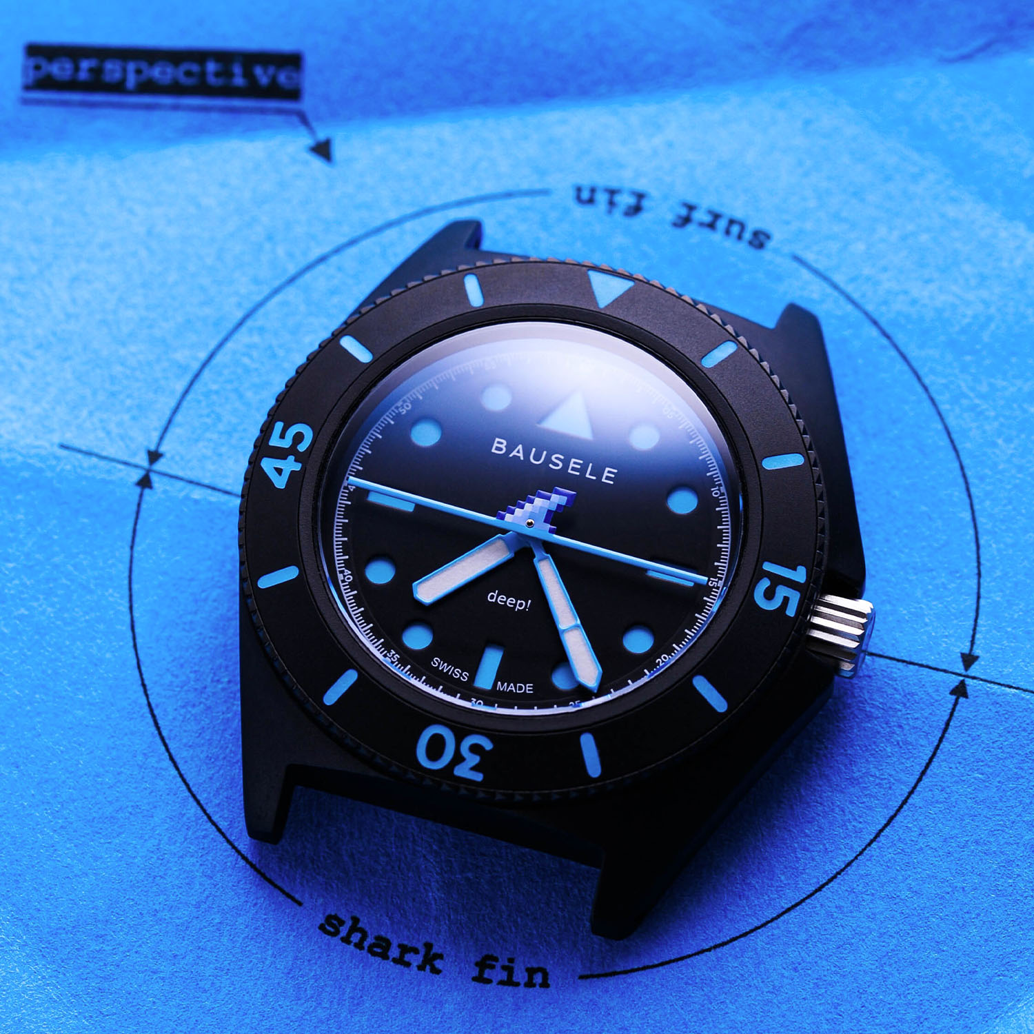 Enters Romaric André. And his idea was all about the fact that he and the team at Bausele are somehow opposite… Not only geographically, but also in terms of personality. Take the Australian “opposite and antipodes” vibes, and bring in a few clichés about the country like, maybe, sharks and surfers. And you end up with an usual seconds hand that, depending on its position on the dial, will bring fear or fun. From 0 to 30, it’ll be a surfboard fin. From 30 to 0, it’ll be a shark fin. It’s all about perspectives. And it’s paired here with multiple sea blue accents on the markers, hands and bezel. And the depth rating is… deep!