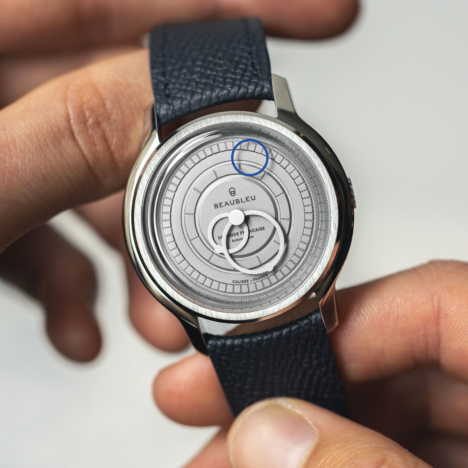 There’s one detail that we’ve not yet mentioned on the Beaubleu Seconde Française… As you might have seen, the seconds hand seems to levitate over the dial, as if it wasn’t connected to the central pinion. A deliberate design choice which marks an evolution over previous creations with an oversized circular hand, the Seconde Française 19.24 and 20.24 feature a full transparent disc over the dial on which the seconds hand has been transferred, making it virtually floating over the dial.