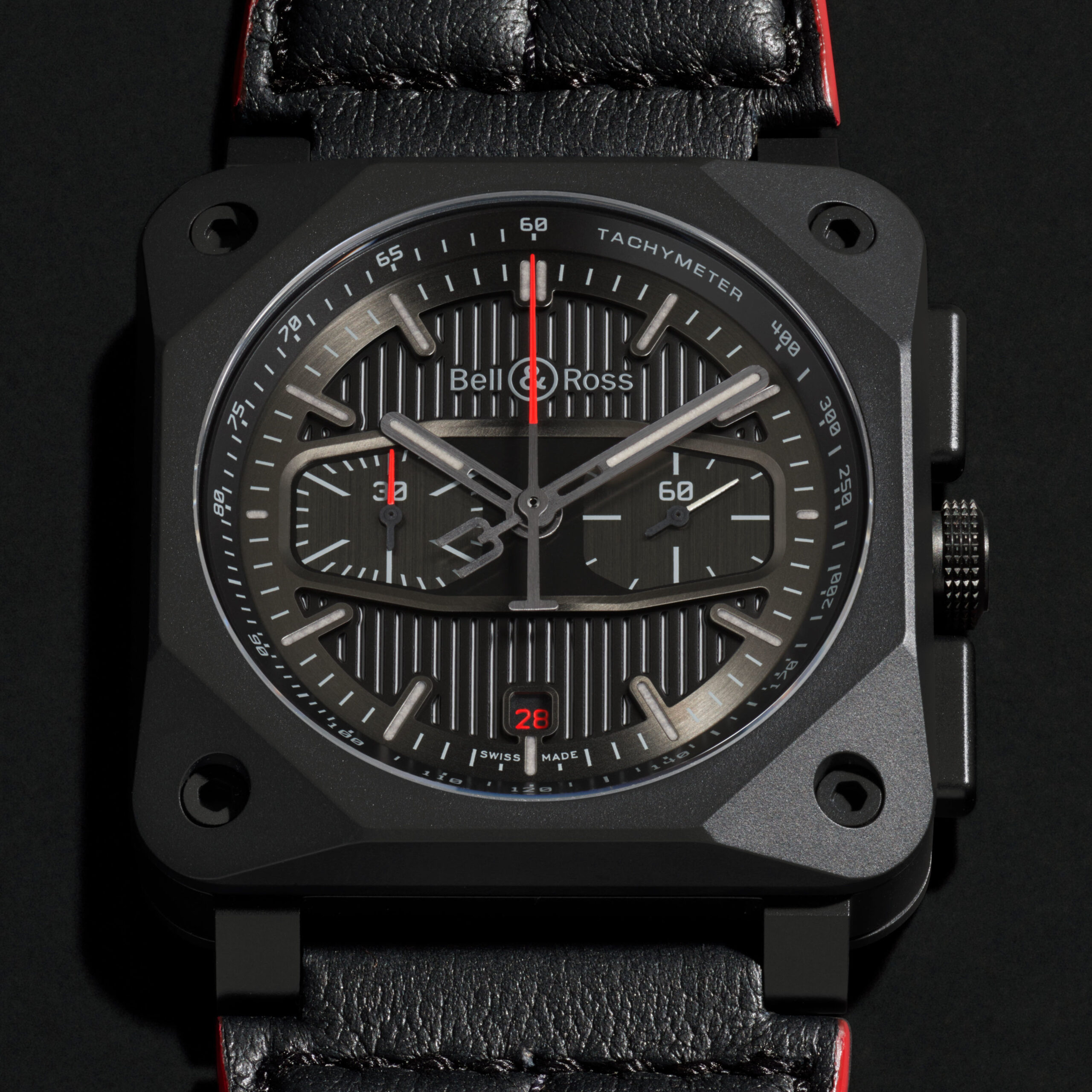 Infused with Bell & Ross’s avant-garde design, the BR 03-94 Blacktrack’s 42mm x 42mm matte black ceramic case with faceted angles and an octagonal bezel perfectly complements the stealth-like appearance of the BT-06 motorcycle. The iconic screws at each corner, a signature BR design element, serve a functional purpose, enhancing the chronograph’s sturdiness.