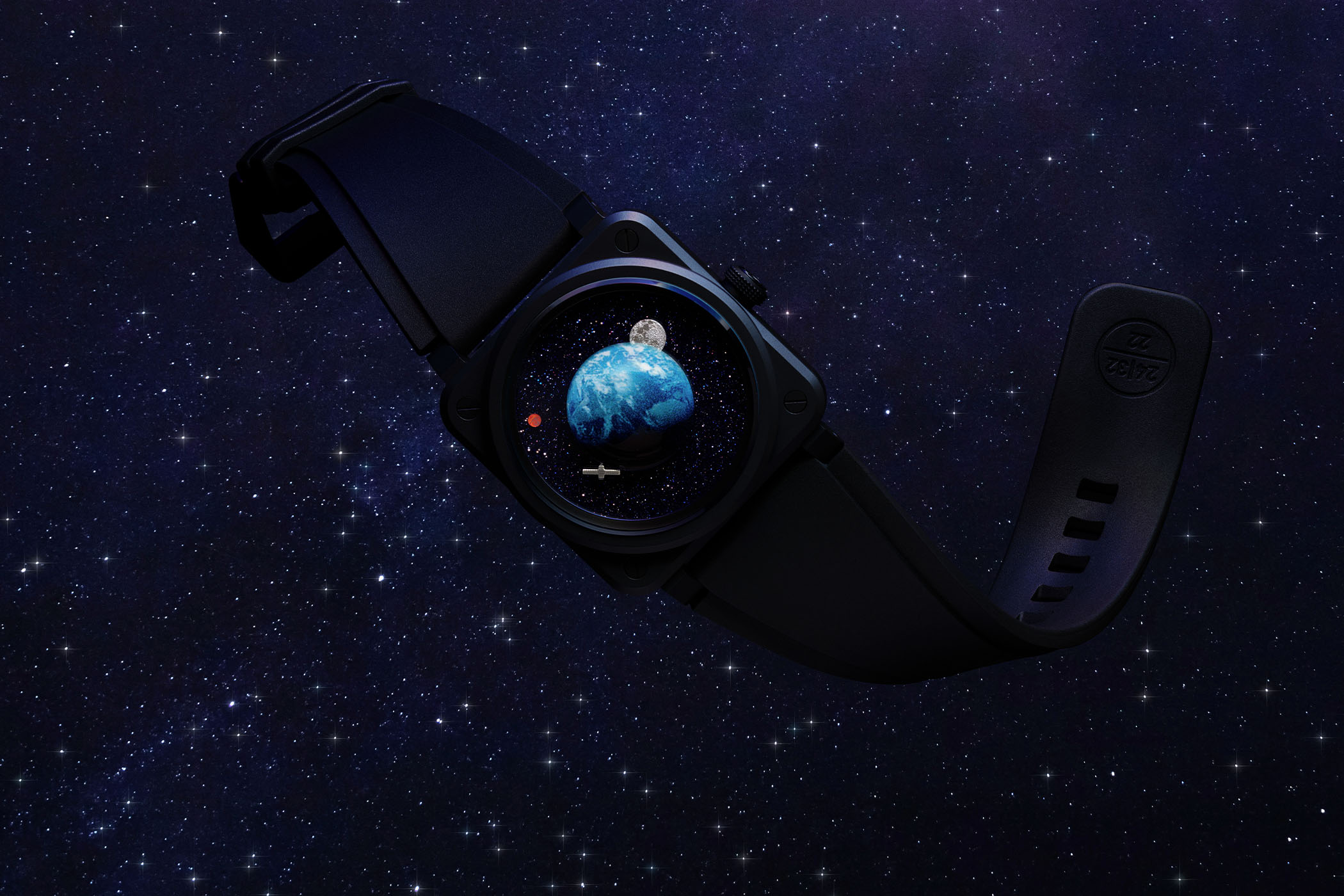 The Bell & Ross BR-03 Astro is presented in the brand’s signature square case that defines the collection – and that has been recently revamped and refined. It is 41mm wide and 11.5mm thick and crafted from black ceramic featuring a micro-blasted finish. The screw-down crown is at 3 o’clock, as usual, but the sapphire crystal is hollowed on the inside to accommodate the dial’s central element – a representation of Earth in relief. Still, water resistance is rated at 100m.