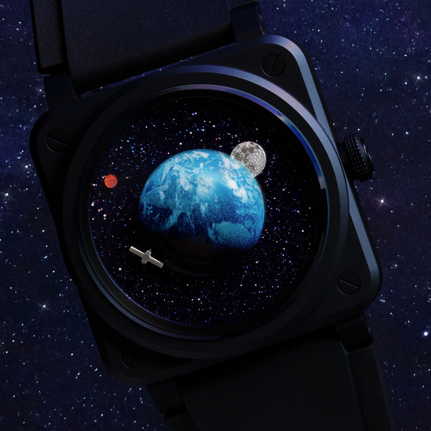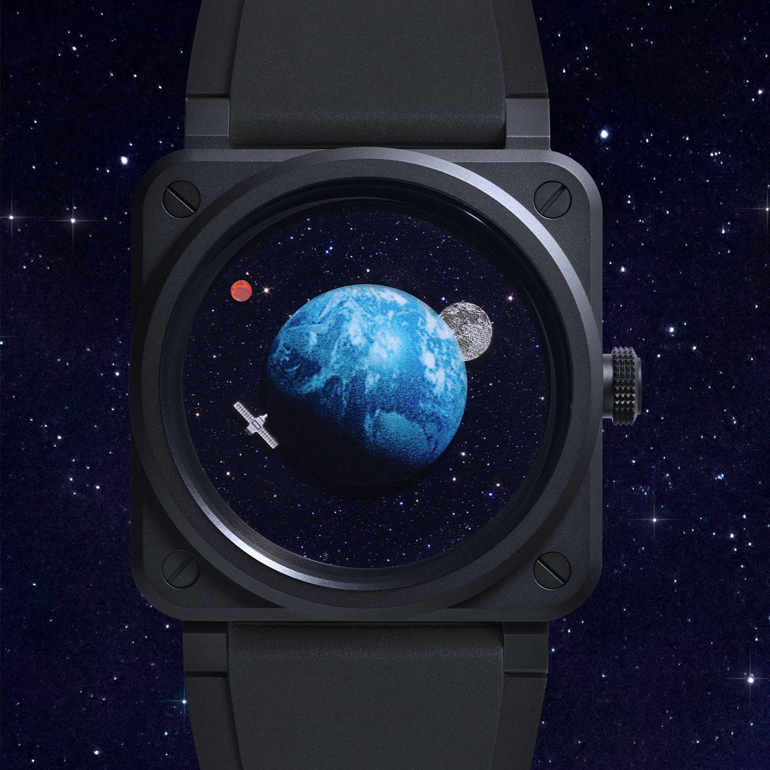 The Bell & Ross BR-03 Astro is presented in the brand’s signature square case that defines the collection – and that has been recently revamped and refined. It is 41mm wide and 11.5mm thick and crafted from black ceramic featuring a micro-blasted finish. The screw-down crown is at 3 o’clock, as usual, but the sapphire crystal is hollowed on the inside to accommodate the dial’s central element – a representation of Earth in relief. Still, water resistance is rated at 100m.