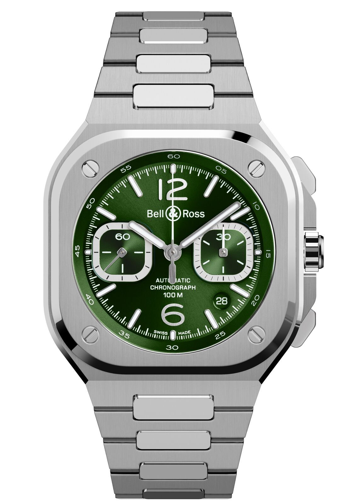 Presented either on an integrated steel bracelet or a textured green rubber strap, the Bell & Ross BR 05 Chrono Green Steel is now available and priced from EUR 6,400. For more details, please visit bellross.com.