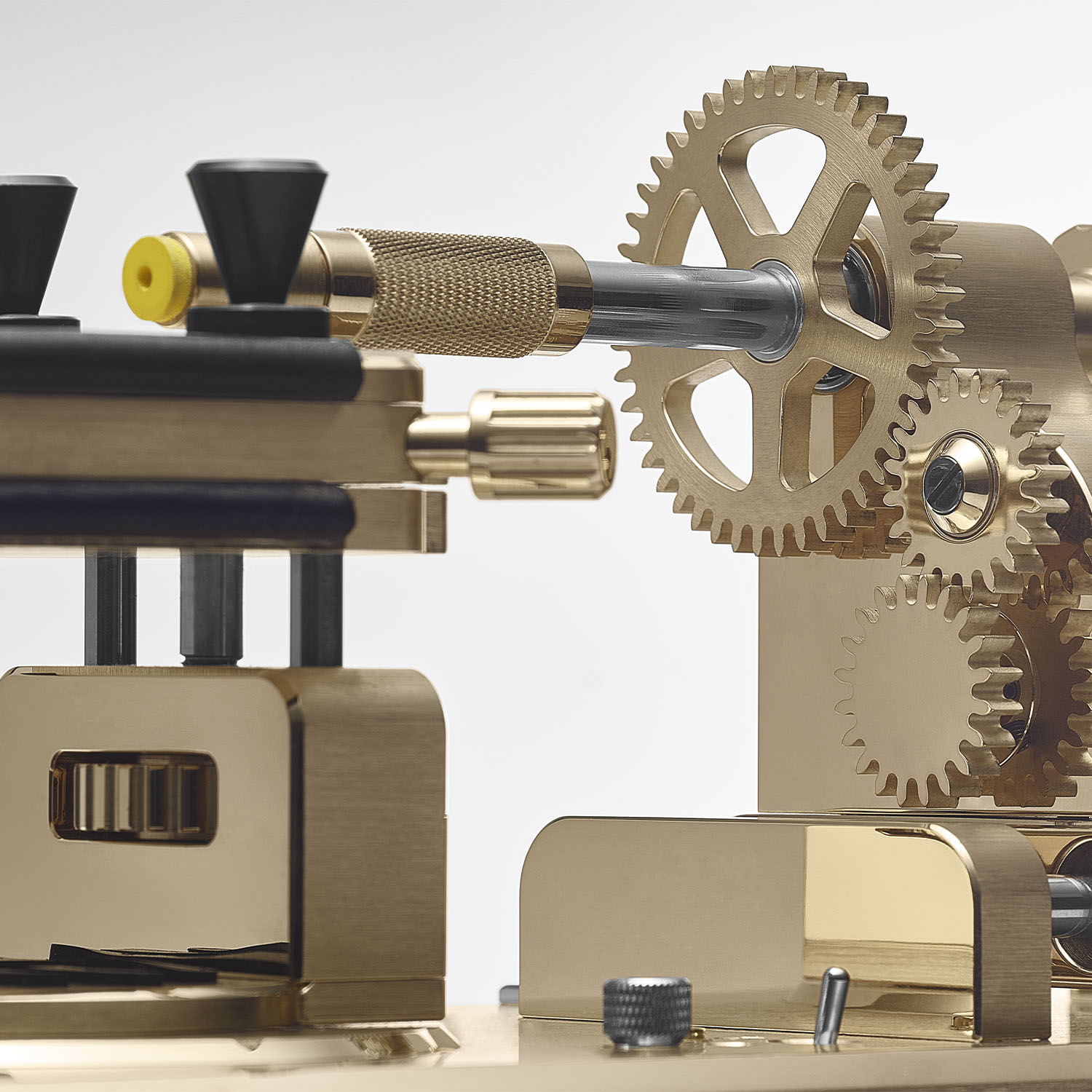 Besides its practical interest, the Bernard Favre Crown Ultimate is a beautiful object inspired by yesteryear watchmaking tools. It is made of satin-brushed and polished steel and gold-plated brass. Its functionality is enriched by a wide array of traditional artisanal decorations: screws are flamed-blued screws, wheels feature circular satin finished, knurling adorns knobs…