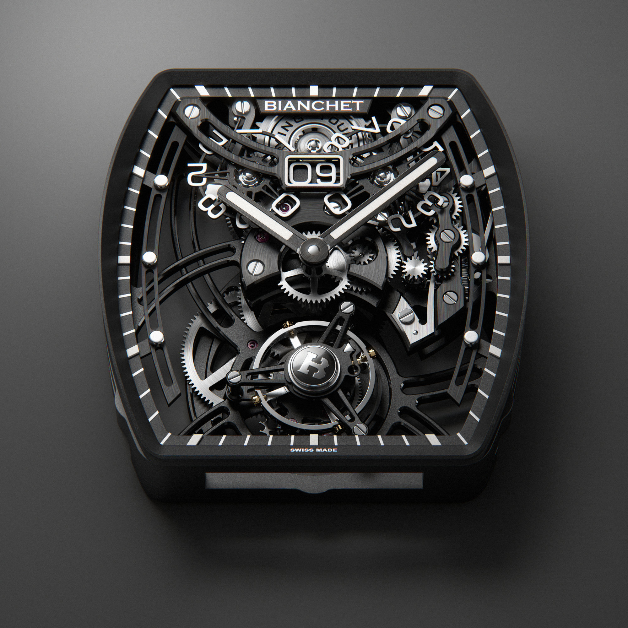 Bianchet has been carving out a name for itself for crafting high-tech shock-resistant sports tourbillon watches, with a signature tonneau shape. The curved profile, integrated rubber straps, and ultra-resilient construction ensure optimum comfort and performance under pretty much any circumstance. To showcase its watchmaking capabilities well beyond the complex openworked movements, Bianchet now presents the fully transparent B1.618 Grande Date Sapphire Edition.