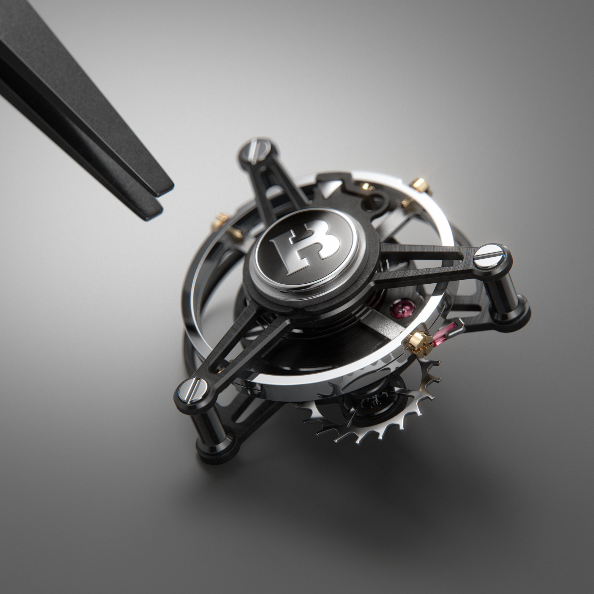 The movement inside the B1.618 has been left untouched from a technical perspective. The proprietary, manually wound calibre has an openworked construction and is regulated by a flying tourbillon at 6′. Running at a rate of 21,600vph and offers a big date display indicated by two openworked discs alongside the hours and minutes. When fully wound, it will keep running for up to 90 hours.
