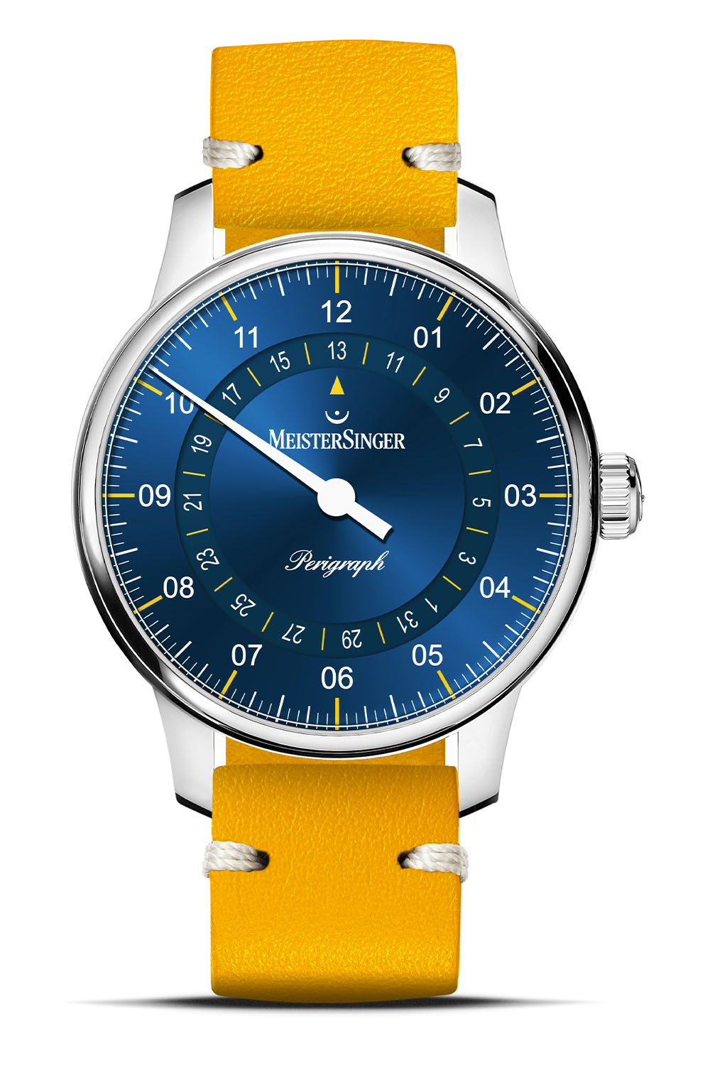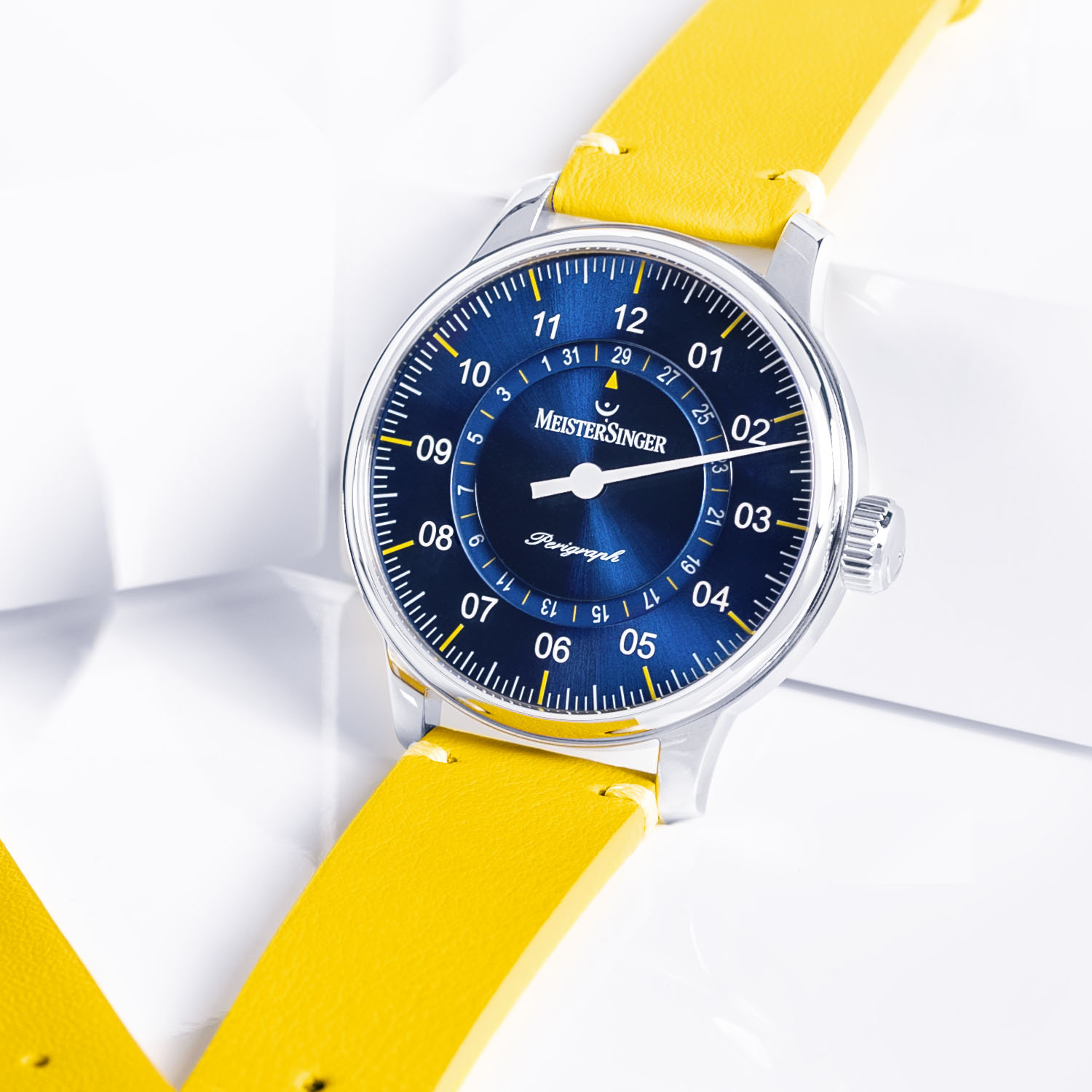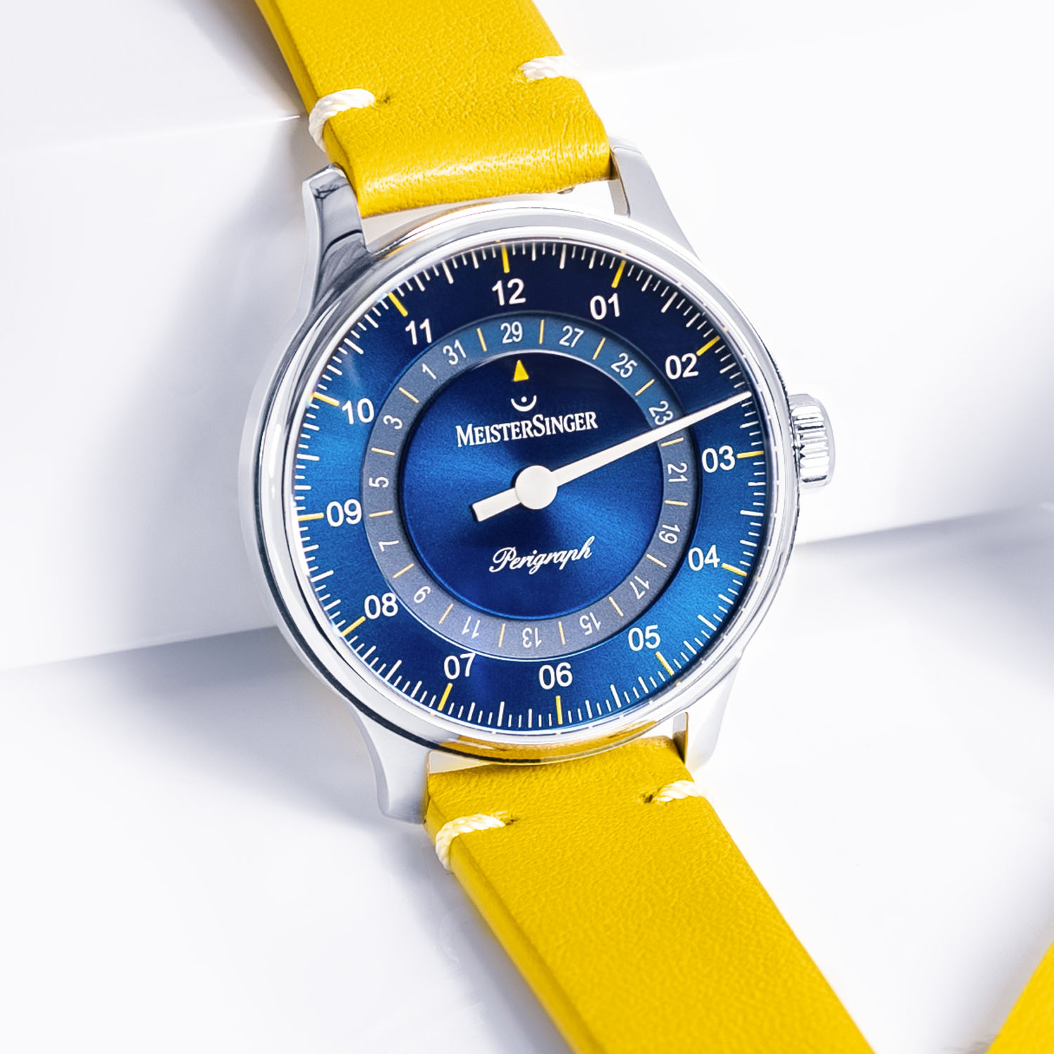 Founded in 2001, MeisterSinger has made a name for itself with one very specific feature; a display that relies on a single hand to tell the time. Indeed, only the hour hand is used, and the minutes are relegated to an approximation to the closest 5-minute mark. The single hand slows things down, removing the constant reminder of the passage of time. It’s a true signature, and it has made the brand unique on the market. Besides the N°01 and N°03, the most classic watch of MeisterSinger is the Perigraph, which adds to the equation a date display. Now, following the launch this spring of a more compact 38mm version, the Perigraph collection sees the addition of 2 limited editions characterized by a fresh and summery colour scheme, mixing blue and yellow.